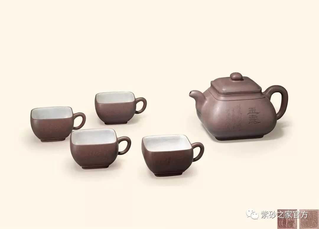 此茶具一壶四杯,器仿簋型,整体协调,极具动感。虽然是方器,但仍然给人以珠圆玉润的感觉,触感绵润的享受。