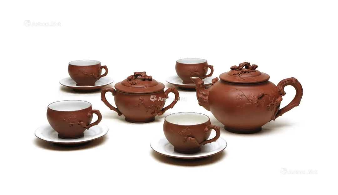 此套顾景舟花器巨制,顾老花货作品不为多见,此作熔多种技法一炉,十头成套更为珍稀,一壶、一缸、四杯、四托,此作也为紫砂壶拍卖至今价格最高者。