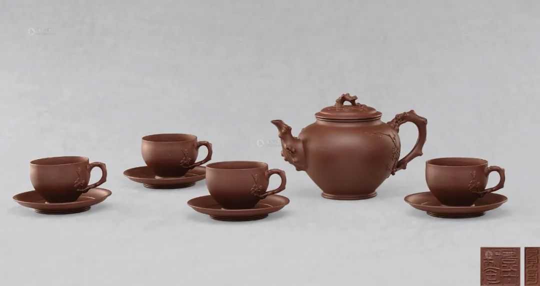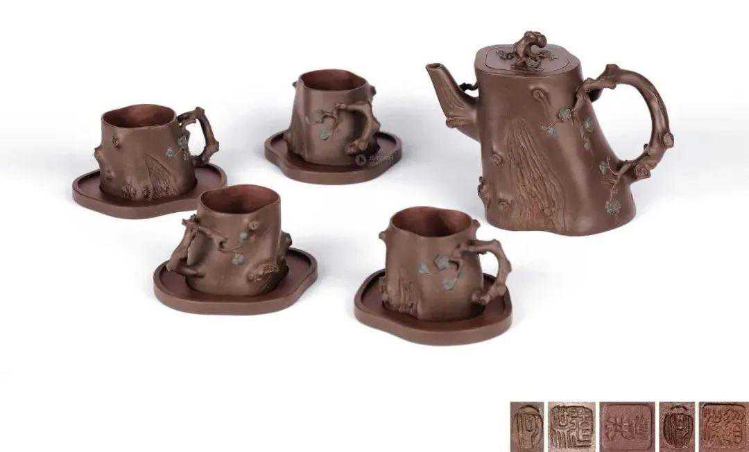9组套壶,除了顾景舟大师的8组,还有一组为中国陶瓷艺术大师——何道洪先生的歪嘴梅桩套壶,成交价为12,650,000元。