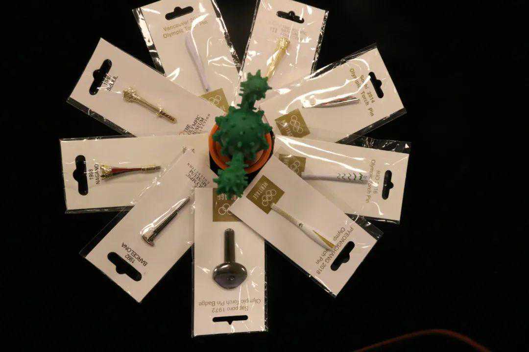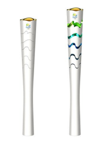 2016年里约奥运会火炬胸针徽章:2016年里约奥运会火炬由再生铝和树脂材料制造而成,上面绘有5条不同色彩的曲线,分别代表大地、海洋、山脉、天空和太阳,同时还对应着巴西国旗的颜色。