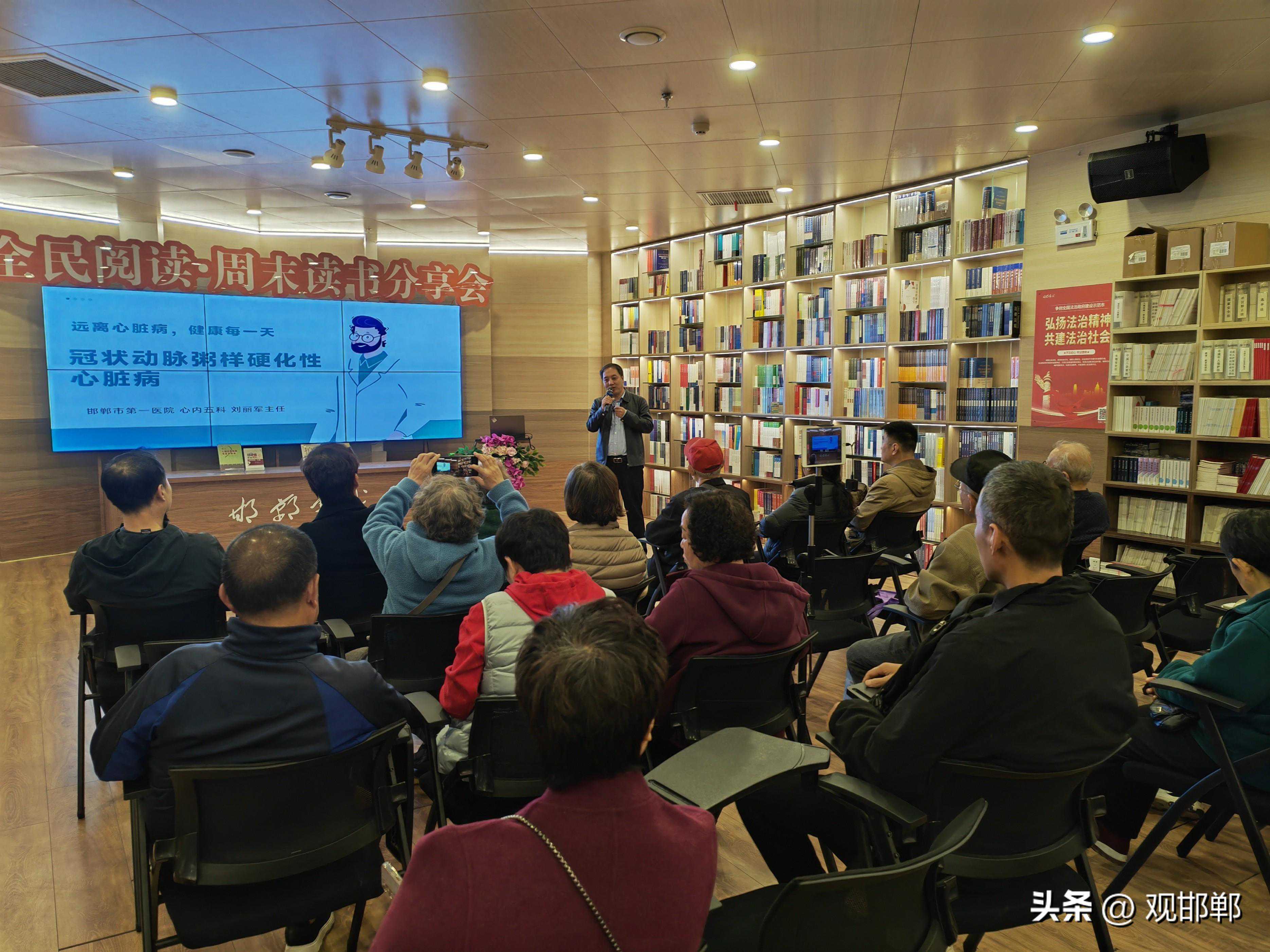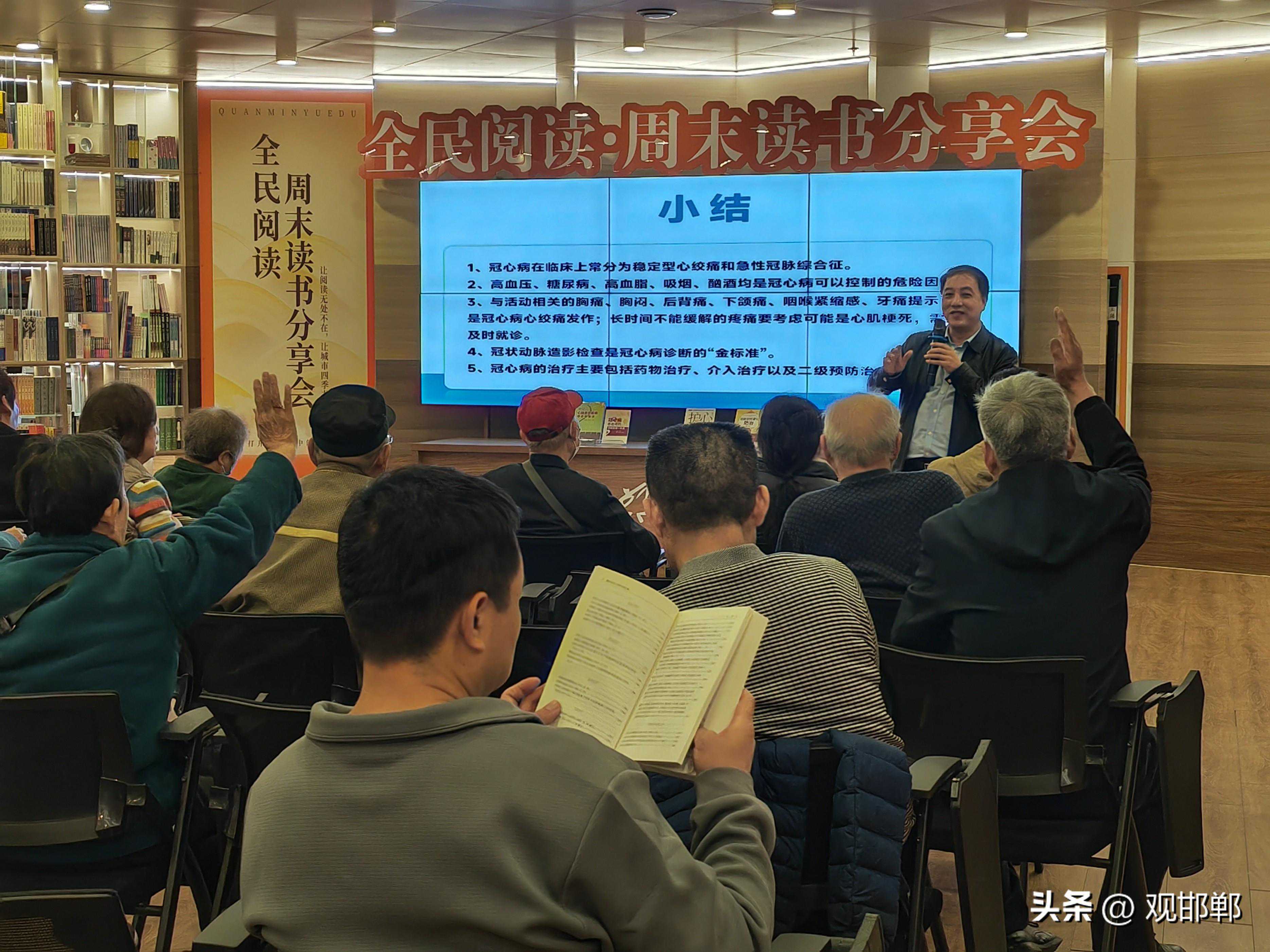 据悉,健康读书会每隔一周在邯郸书城举办一期,是广大读者自愿参加的公益健康科普活动。自开办之初,就秉持着以多读书、读好书为平台载体,以健康身心、重在预防为健康之本,邀请各医疗单位专业人士,为广大读者讲解疾病预防知识,普及健康常识,增强健康意识,最终实现提高生活质量的健康目的。