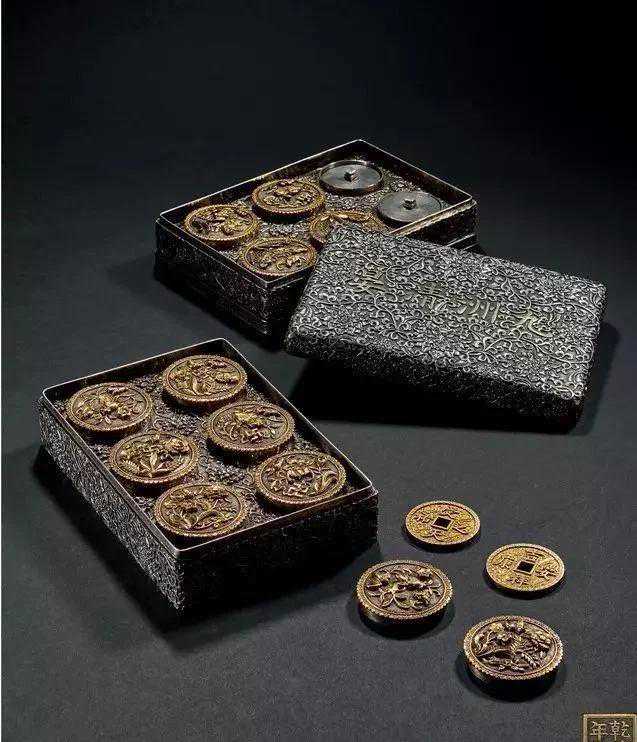 清乾隆二十五年乾隆御制祈福金钱,一盒两层十二枚,金质,方孔圆钱,钱样枚枚精致,雕工精湛。金钱十二枚配有原装银盒。九洲清晏”是圆明园一处寝宫,此套宫钱应是专为“九洲清晏”打造。金钱放置的内槽,可谓独具匠心,钱内穿处的凸起按下可旋转钱槽底部,旋转后槽底上凸,将金钱顶出,而向相反方向旋转,金钱则被锁于槽内,配上钱盖,严丝合缝,精妙至极。