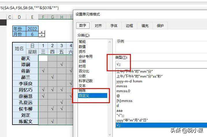 COUNTIFS函数可以进行多条件计数,本例中是根据日期和D列姓名统计,如果某日值班则显示1,否则显示为0。如下图所示:
