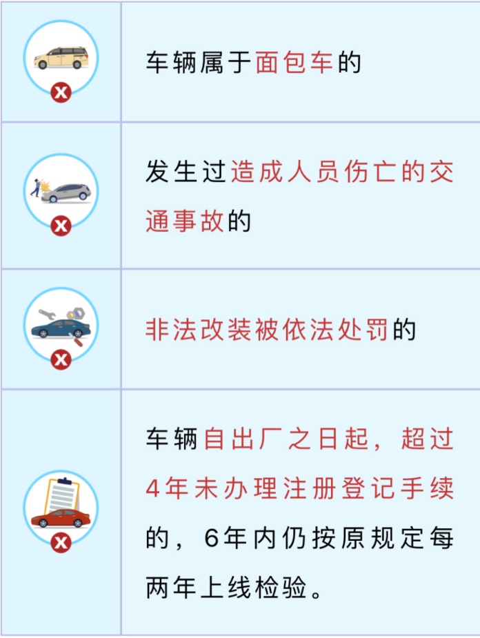注:存在以下情形的车辆不属于“免检”车辆范围,需按原规定周期检验。