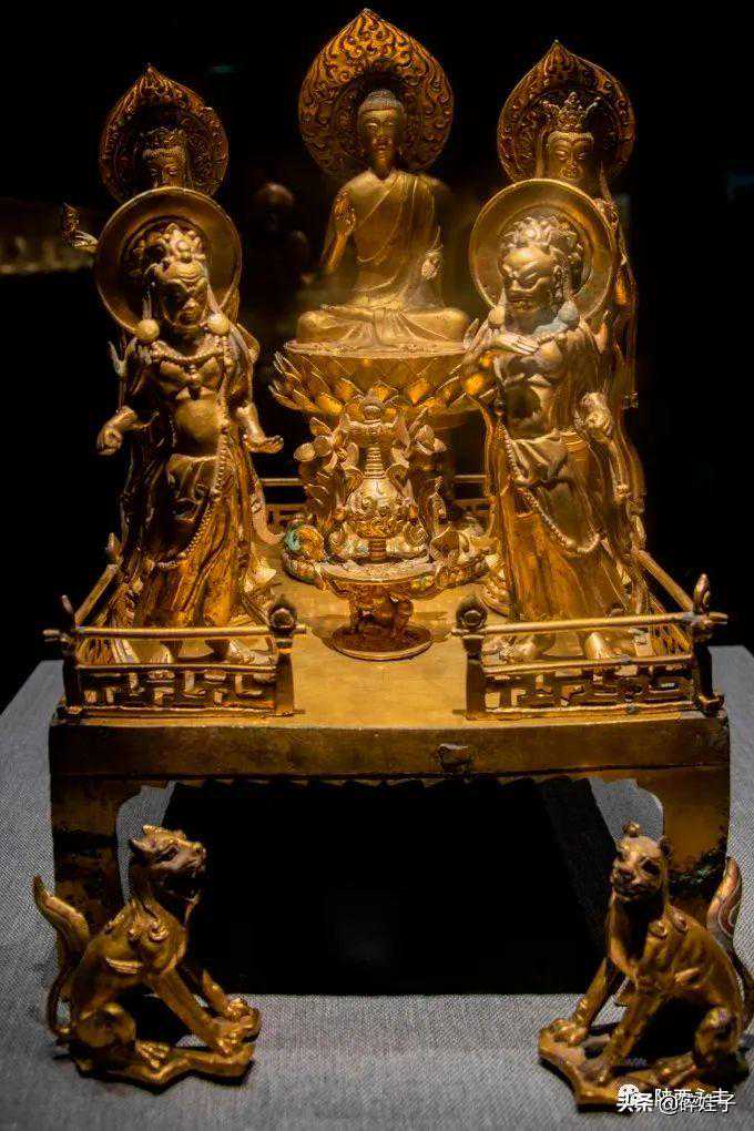 隋董钦鎏金造像阿弥陀佛像,西安博物院镇馆之宝,高41.0厘米,座长24.6厘米,宽24.0厘米,重13.27公斤。1974年西安市雁塔区八里村出土,造型端庄,富丽堂皇,西安博物院镇馆之宝之一。该造像由高足床上一佛、二菩萨、二力士、一香熏、四足方形床和两蹲狮组成。阿弥陀佛结跏跌坐于高足床正中的束腰莲花座上,两胁侍菩萨头戴高宝冠,两金刚力士跣足,裸露上身。高足床正中置一蔓枝莲花簇拥的香熏,香熏下有一裸体侏儒用力托举香熏,造型生动。一对蹲狮位于床前,十分劲健。佛像、莲座、高足床及其他23个附件均为单独铸造,其间有插榫孔眼相连接,可拆卸。