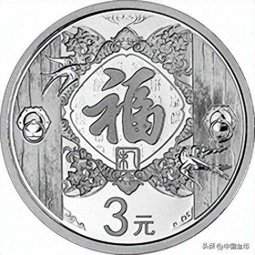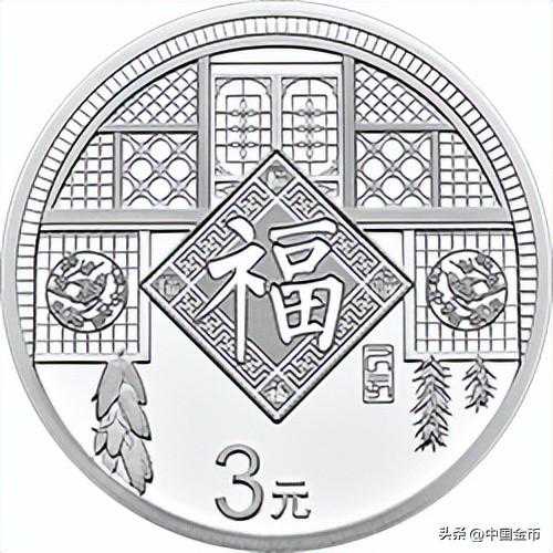 首先映入眼帘的是一面影壁。影壁中镶嵌着古色古香的窗棂,窗棂中的中国结上有一个行云流水般的“福”字。影壁上雕蝙蝠展翅,有“窗明蝙蝠飞”之意。下绘牡丹簇拥,有“春色岂知心”之叹。再加回字纹、祥云纹、如意纹、吉草纹等,表现了“春满乾坤福满门”的祈愿。此币设计元素多而不乱,构思精巧,寓意美好。