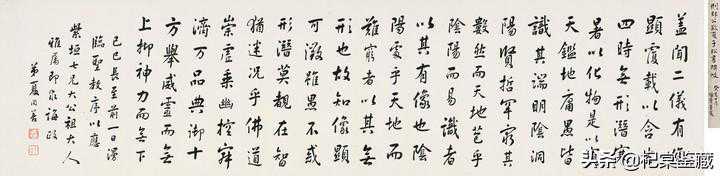 题识己巳长至前一日,漫临圣教序以应紫垣七兄大公祖大人雅属,即求诲政。弟夏同善。钤印夏同善印、子松签条王继曾(1881-1955)题:刑部公款夏子松横批。癸亥(1923年)十月,继曾重装。释文盖闻二仪有像,显覆载以含生;四时无形,潜寒暑以化物。是以窥天鉴地,庸愚皆识其端;明阴洞阳,贤哲罕穷其数。然而天地苞乎阴阳而易识者,以其有像也;阴阳处乎天地而难穷者,以其无形也。故知像显可征,虽愚不惑;形潜莫睹,在智犹迷。况乎佛道崇虚,乘幽控寂,弘济万品,典御十方,举威灵而无上,抑神力而无下。说明上款人“紫垣七兄”乃王庆云次子,王传璨(1826-1882),乳名兑,字流谦,一字子恒。附生,曾任刑部主事。作者介绍:夏同善,字舜乐,号子松,浙江仁和人。幼年丧母,随继母住在外婆家。他从小酷爱读书,遍读外祖父所藏典籍。咸丰五年(1855),中举人,次年进士及第,钦点翰林,并赐“翰林第”匾。夏同善文章超群,时人誉谓“在曾(国藩)、左(宗棠)之上”。慈禧太后十分赏识他的才学,曾命他和翁同龢一起为光绪帝侍读。英法联军入侵时,夏同善坚决反对议和,主张“以兵备之,以民备之”。咸丰十年,太平军起兵江南,他疏请曾国藩统领江南各军阻击。同治六年(1867),升少詹事,十年任兵部右侍郎,建议朝廷扩大赈济、广开言路。夏氏历官咸丰、同治、光绪三代,尽忠尽职。