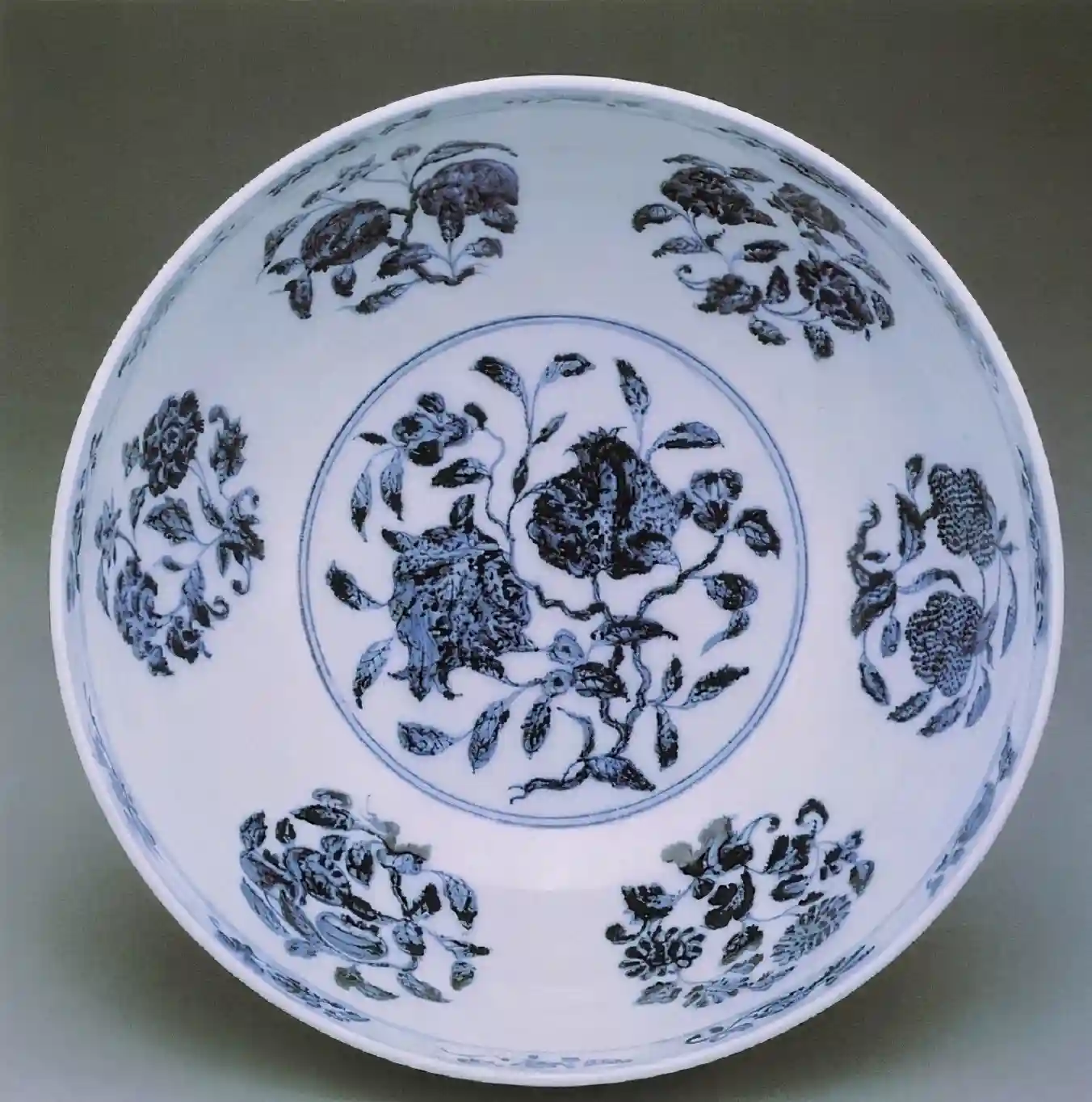 还有就是整个盘子的内璧绘画也是够大气的,有折枝花果外加青线十二道,特点十分的明显。但这一个大碗,却被质疑是假的。