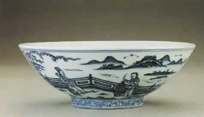 最后一个与第一个情况比较相同,一个《青花秋夕诗意仕女图碗》也是宣德窑的东西。这一只碗有一些康熙时期的味道,而且外壁画的是庭园景物,几个侍女呆在一起,讲的就是人物与秋景的配合。但大家看胎色与青花匀浓的程度,不少网友吐槽它也是假的。