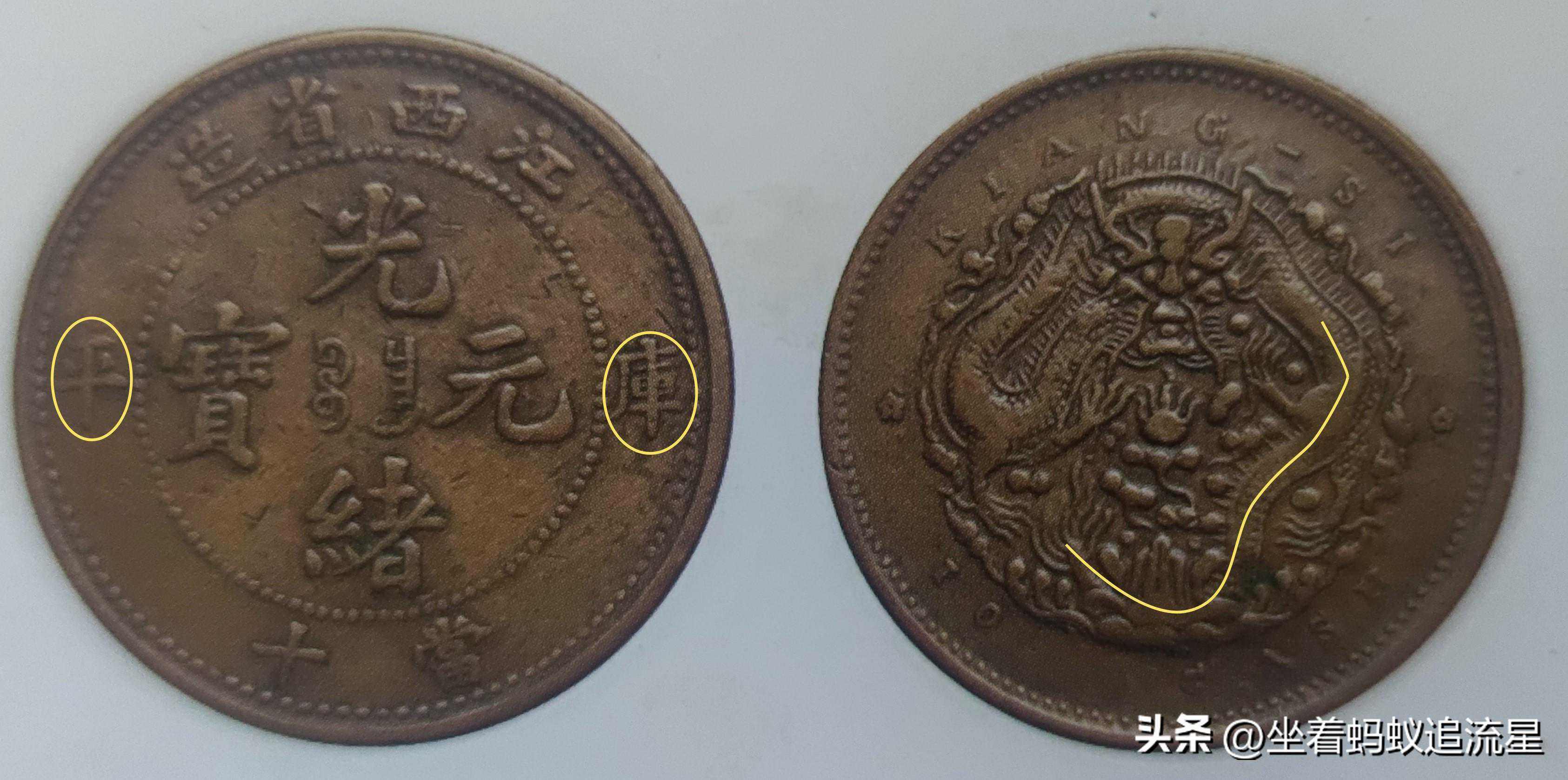 库平蛟龙少云/5级(正面为:上缘铸“江西省造”,下缘铸“当十”,左右铸“库平”,中间铸“光绪元宝”四字。背面龙图为蛟龙,与其他蛟龙不同的是,此版蛟龙9点钟龙身处是没有云朵的)