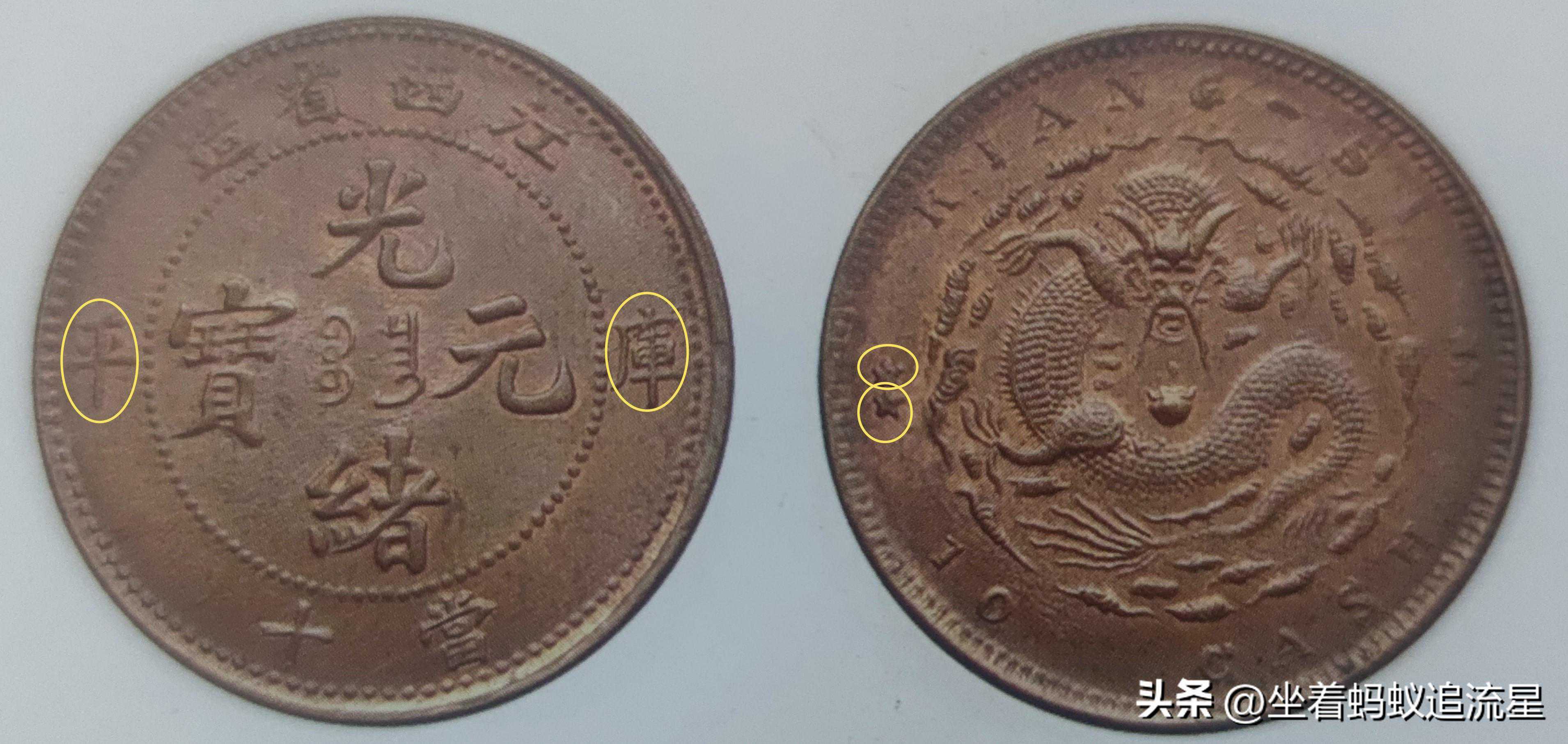 尔宝see/8级(正面为:上缘铸“江西省造”,下缘铸“当十”,左右铸“库平”,中间铸“光绪元宝”四字,注意“寳”。背面龙图为坐龙,与其他坐龙不同的是,此版坐龙1点钟方向的英文为See)