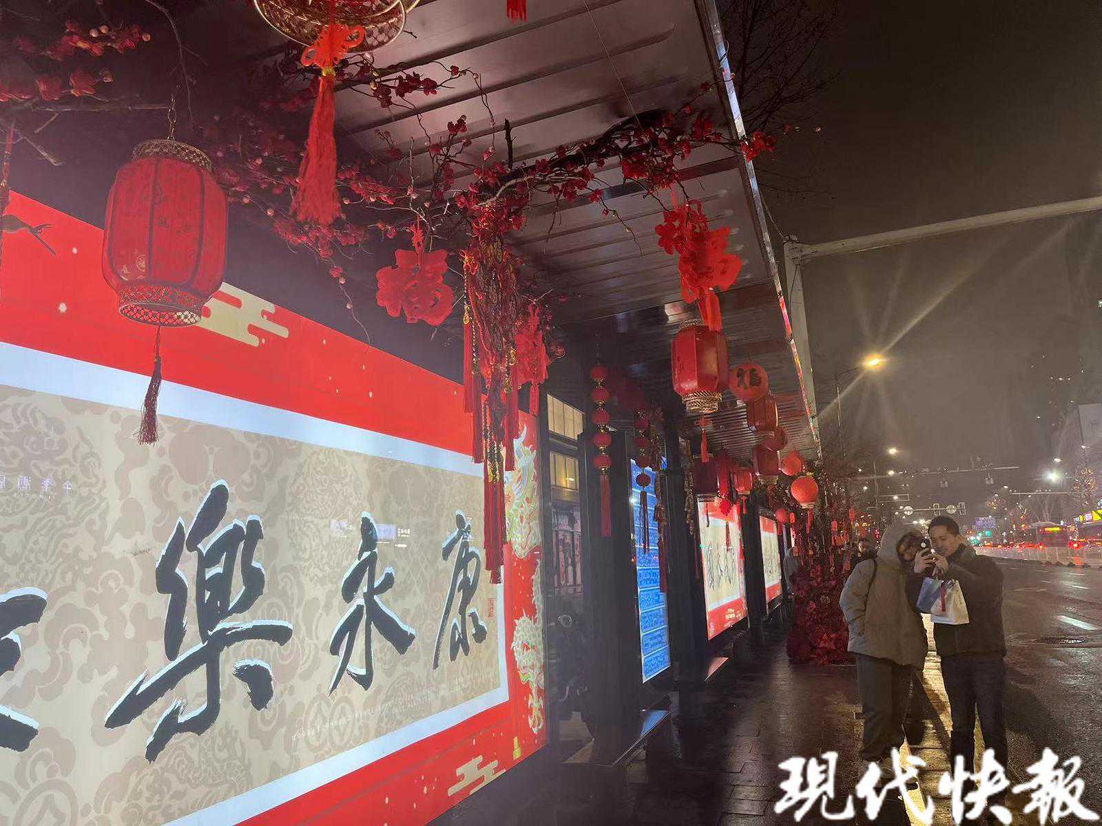 春节前夕,南京部分站台、自行车广告牌被梅花、灯笼、中国结布置得喜气洋洋,广告灯箱里以南京云锦纹样为背景,“国泰民安”“我爱南京”“家和业盛”和“长乐永康”等书法作品,更是为站台增添节日氛围,不少市民拍照打卡。