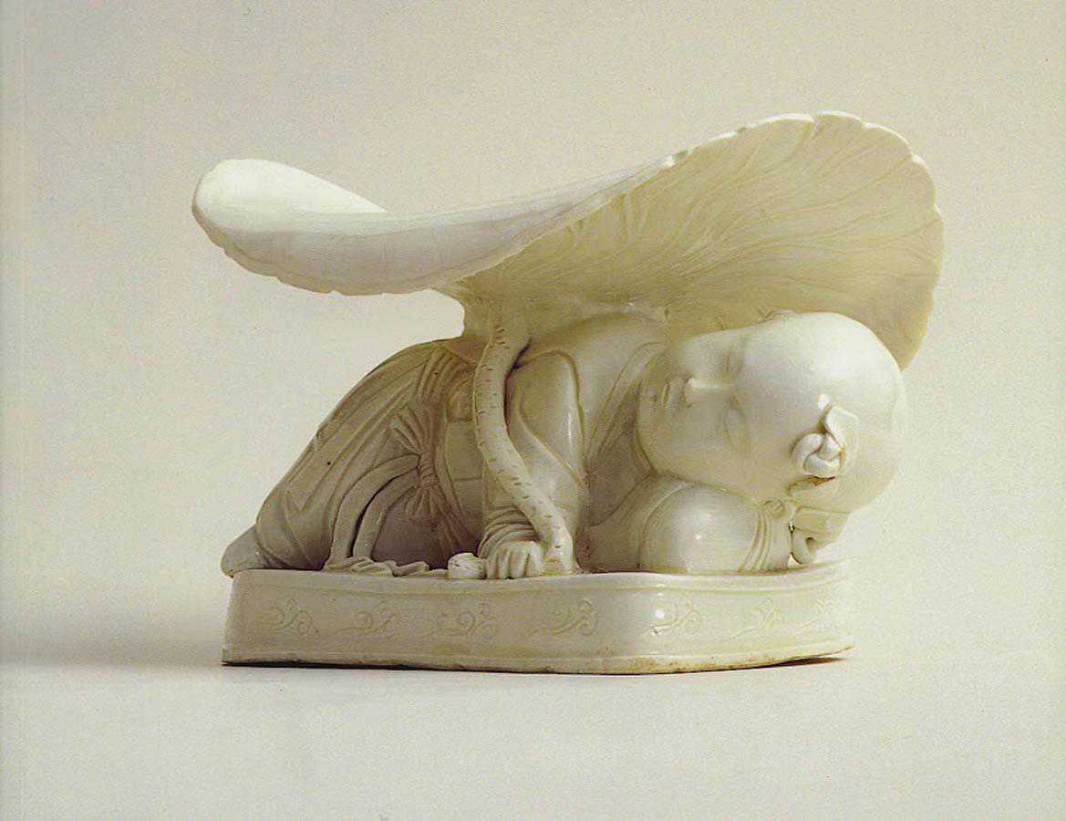除了这类,孩童呈俯卧状、以背部作枕面的造型外,当时还有一类将孩童塑成侧卧状、上托荷叶形枕面的孩儿枕,也很流行。有学者研究,这类具有荷叶枕面的类型,很可能与宋代七夕风俗中小儿执莲叶效颦磨喝乐(佛教中称摩睺罗,即化生童子)的习俗有关。总体上讲,这两种造型的孩儿枕其实可以归为一类,本质上都反映了宋人思维中生育子嗣、多子多福的传统生育观念。古人正是希望通过“瓷枕—梦境”这一实践方式,来获得“梦想成真”的交互效果。