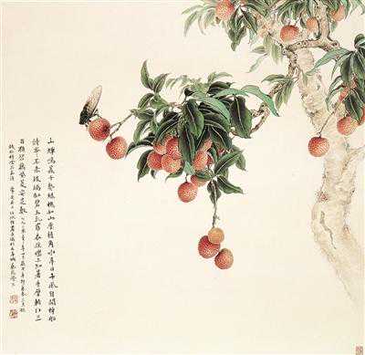 在花鸟画中,荔枝是任斌强喜欢表现的题材,对于这一岭南佳果的质感表现,可看出作者对本体绘画的追求,精细而鲜活的动物以及诗文题跋所营造的意境,画面不再是普通的水果,而是画家心性流露的载体,是画家抒情达意的象征。
