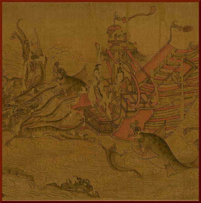 此画是以曹植的《洛神赋》为蓝本创作的。此长卷采用连环画的形式,随着环境的变化让曹植和洛神重复出现。从开头描写平静的水面上出现飘飘若仙、含情脉脉的洛神,似来又去与曹植处于可望而不可及的无限惆怅之中。后几段画洛神在云间遨游,或与曹植在一起游赏。最后画洛神驾六龙云车而去,曹植坐舟追寻。此画用色凝重古朴,具有工笔重彩画的特色。山水树石均用线勾勒,而无皴擦,与画史所记载的“人大于山,水不容泛”的时代风格相吻合。