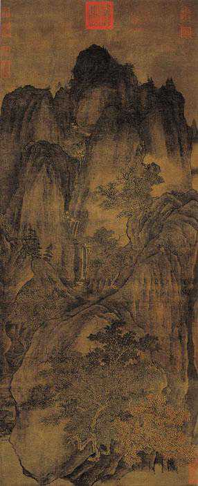 画面正中画峭拔的主峰,山涧丛生寒林秋树,涧水悬瀑曲折而下,气势壮伟。画上无款,仅边幅上有明代王铎题语,指明为“关仝真笔”,并誉为“结撰深峭,骨苍力垕,”“磅礴之气,行于笔墨外”。画上钤有明纪察司半印及“秘园”、“乾隆御览之宝”等收藏印章,《石渠宝芨初编》著录。