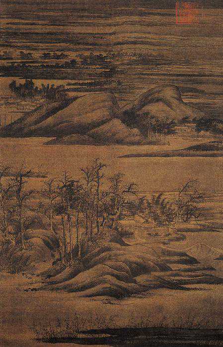 此图表现江南水乡风景,画下方近处以重墨擦染沙岸,细笔勾出芦荻,画面中部陂陀上寒林丛中露出村舍板桥,远方溪水对岸也绘有山丘村舍,再远处溪岸重重,延伸至画外,以湿墨擦染而出,予人以一望无际之感,是典型的董氏水墨江南风景。画幅右上钤有“宣文阁宝”大印,可知在元代曾为内府收藏,诗堂上有“魏府收藏董元画天下第一,董其昌鉴定”题识。
