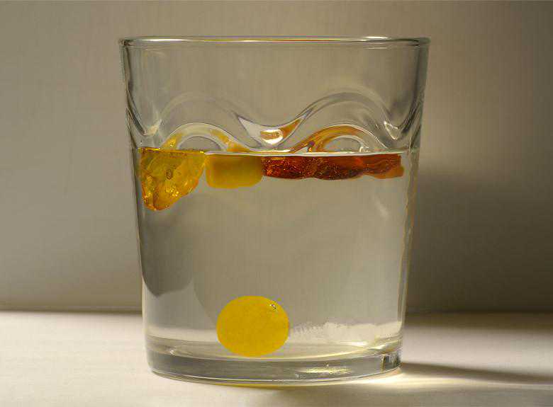 2.【泡盐水】天然琥珀质地虽然很轻,当您把该俄罗斯特产(无任何金属镶嵌物的琥珀)放入水中时它也会沉入水底。如果您将溶解的浓盐水加入其中,当盐的浓度大于1比4时(1份盐,4份水)真琥珀就会浮起来,而假琥珀是浮不起来的。