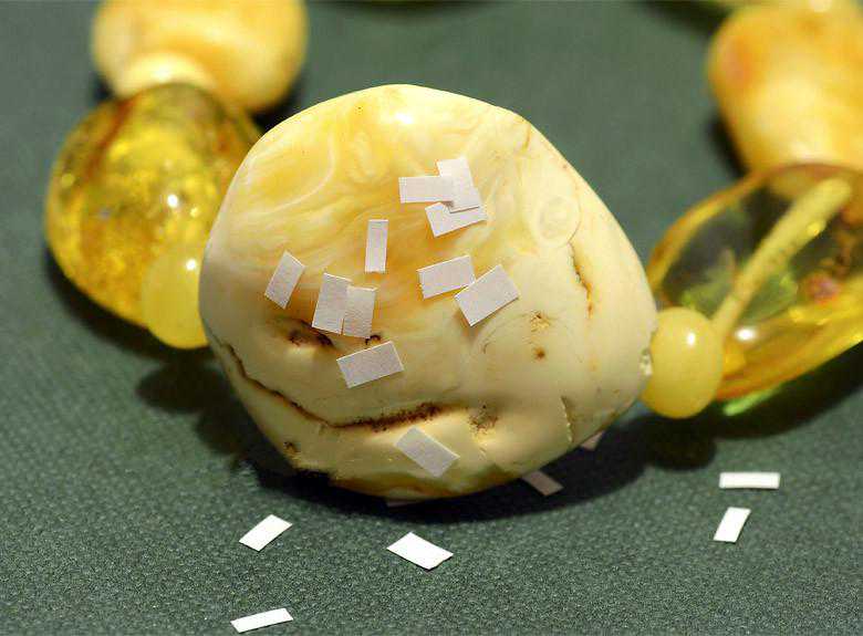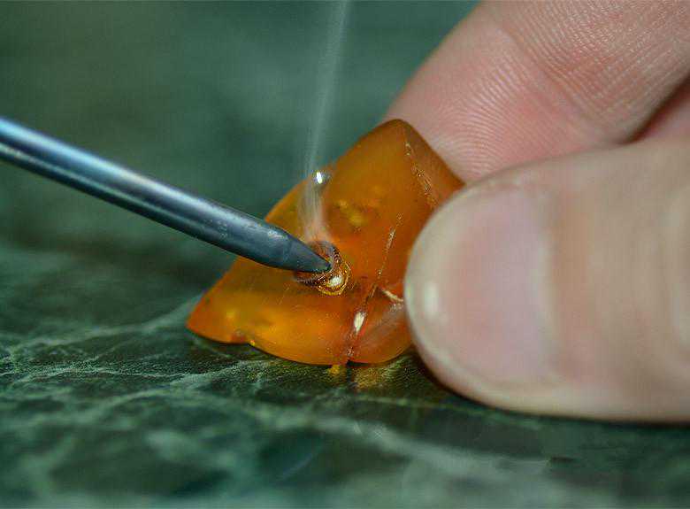 9.【硬度实验】用针轻轻斜刺琥珀背面时会感到轻微的暴烈感和十分细小的粉渣。如果是硬度不同的塑料或别的物质,要么是扎不动,要么是很粘的感觉。另外,新琥珀的珠子穿孔处会残留琥珀粉,塑料质地的假货不会有粉状物残留。