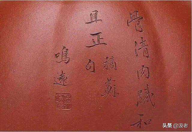 陈鸣远对中国紫砂艺术作出巨大贡献,上期《汲古斋》杂志主要介绍他开创紫砂“花器”先河,这期着重介绍他开创紫砂文化先河。我说的没有文化的紫砂壶,是一把愚蠢的壶,这符合毛泽东指出没有文化的军队,是一支愚蠢军队的逻辑。明朝以前制作的紫砂壶,壶体上只刻有制壶人的名字,是陈鸣远开创了壶体篆刻诗铭之风,署款以刻诗铭和印章并用,款式新颖,中国文化气息浓郁,有盛唐诗赋之风雅,奠定了紫砂壶文化与中国文化一脉相承的基础。