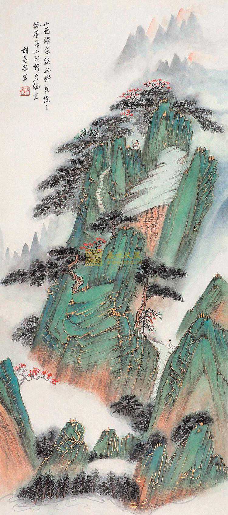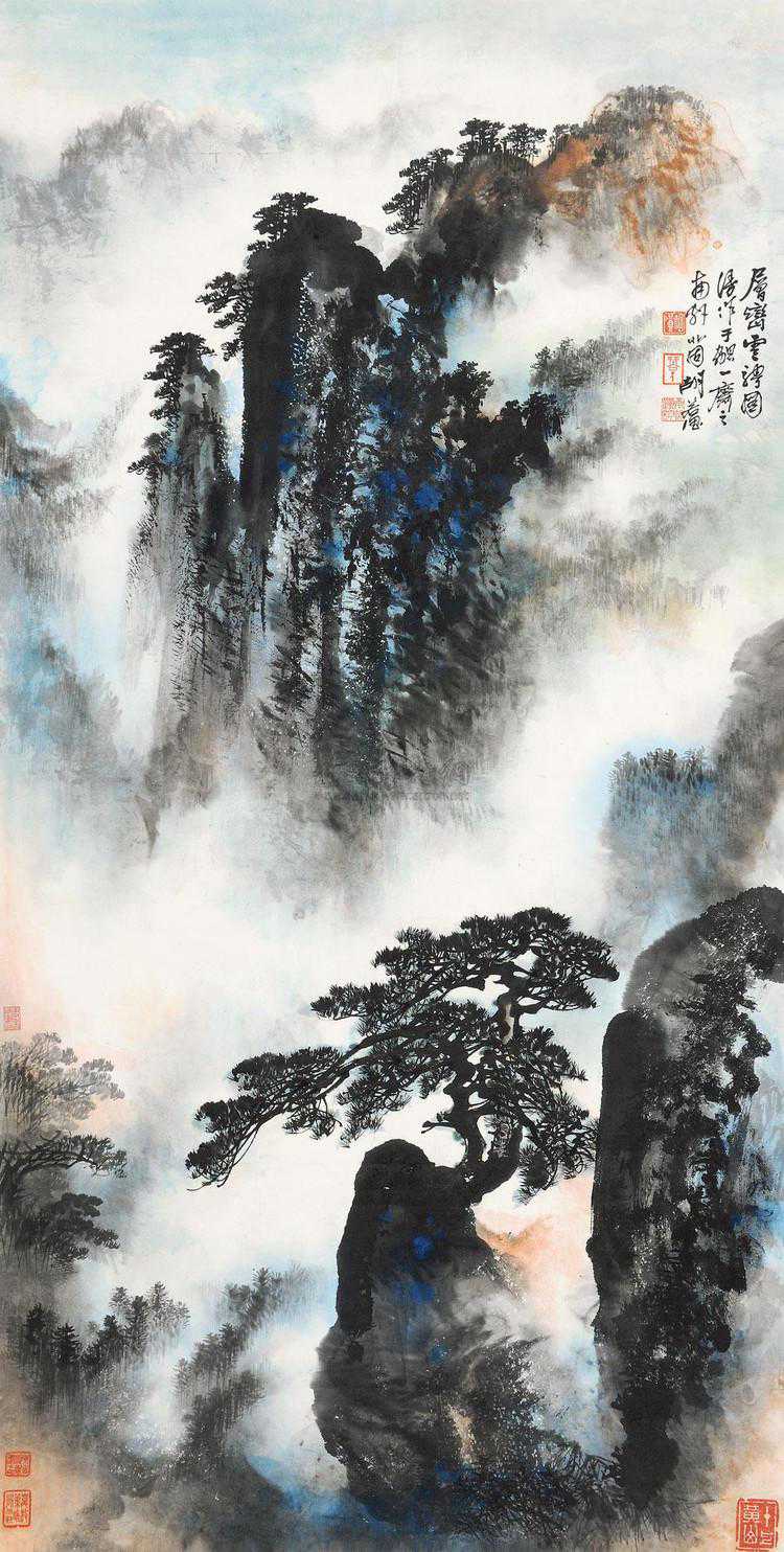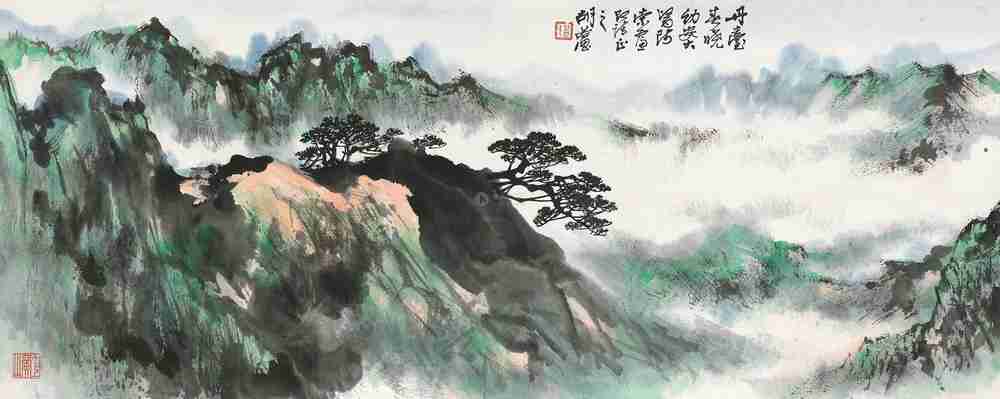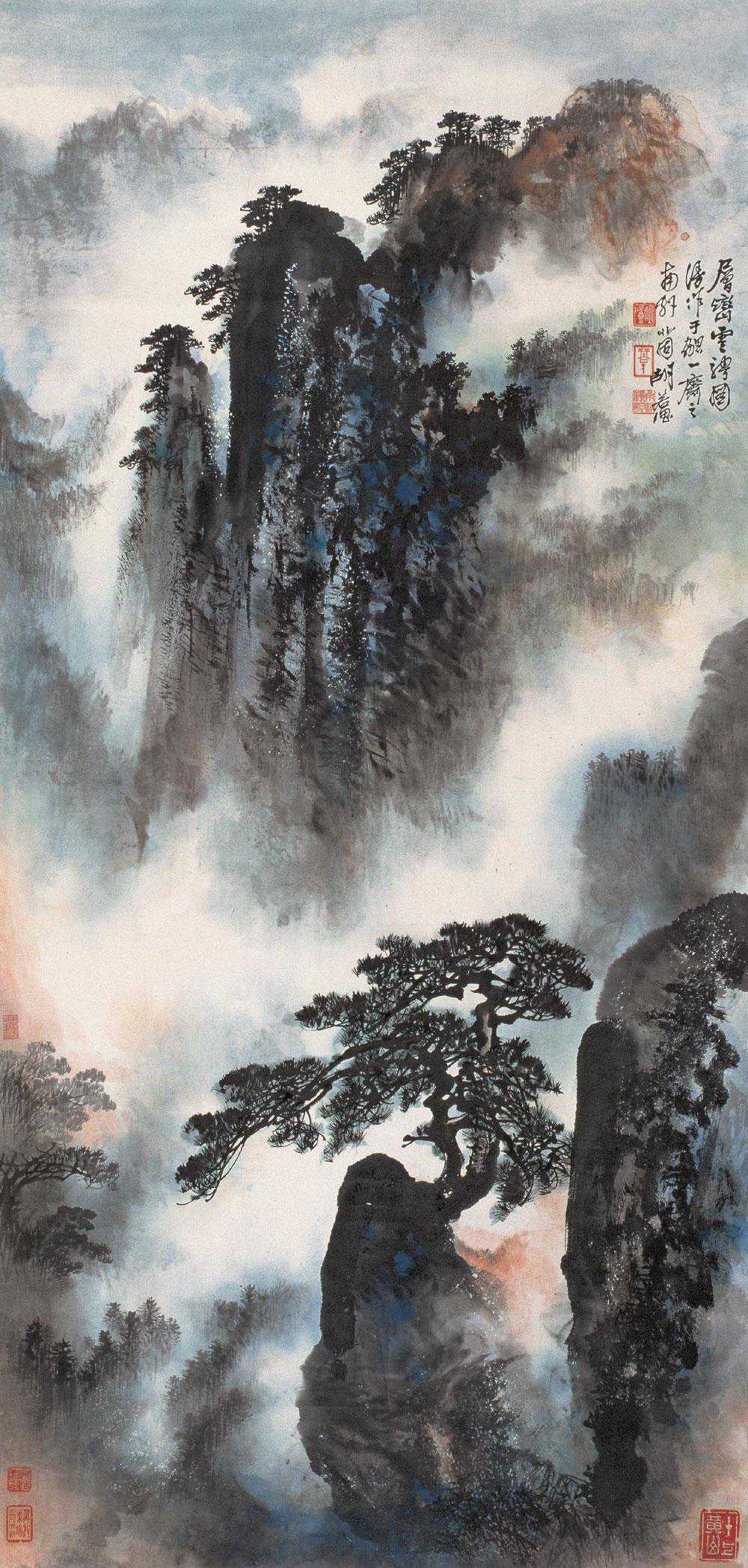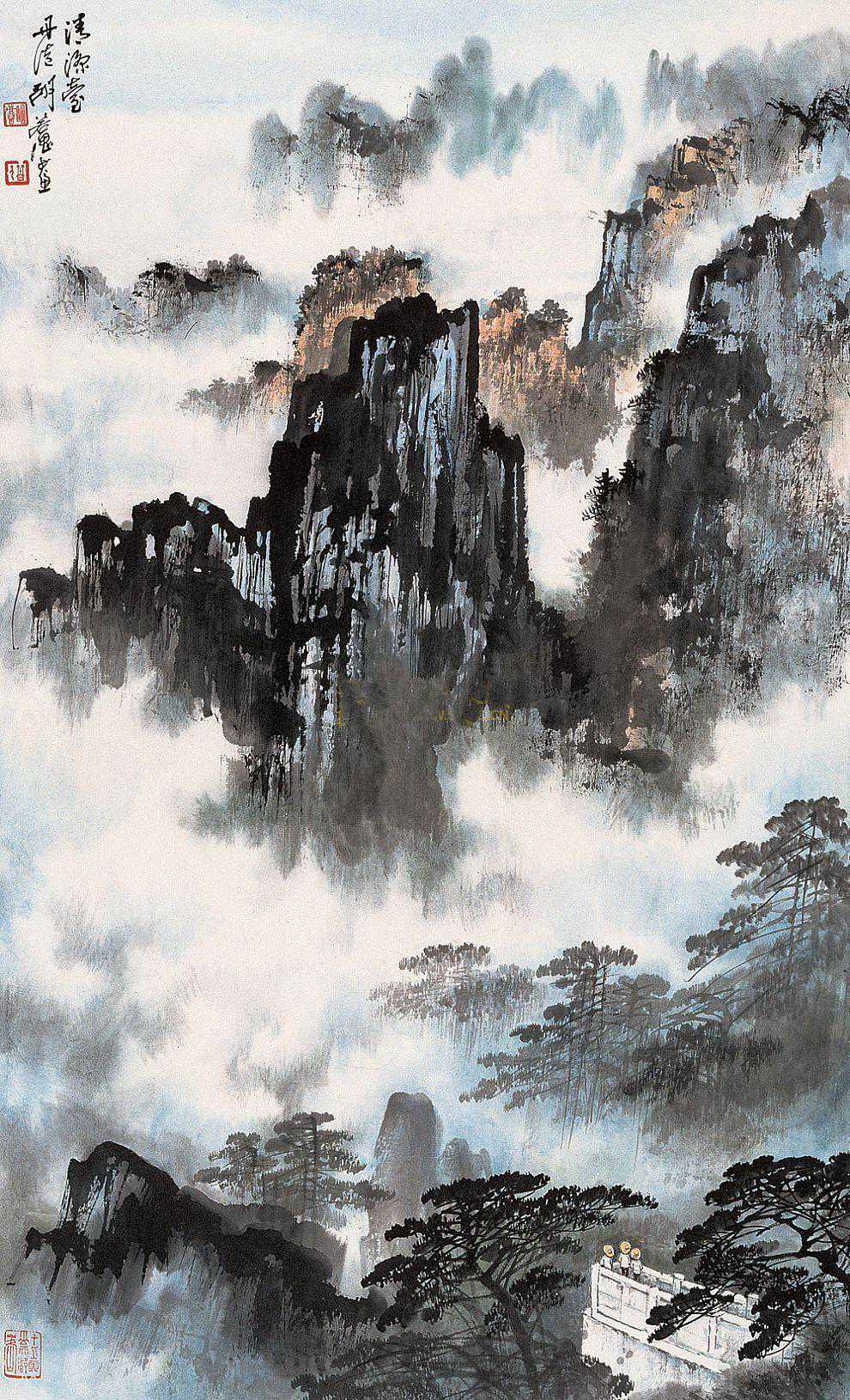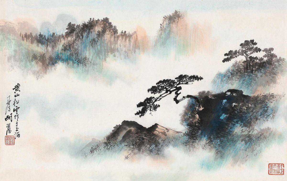 胡若思以黄山为表现题材的系列作品,普遍带有一种舒朗的快意。此图也是表现晴朗的黄山。群山在雾中隐现,而雾淡薄轻盈,倍显清丽。胡若思的山水画创作已不是纯粹的传统表现手法,显然接受了一些外来因素的影响,从而使山之境界更广,气势更大。从近百幅绘作来看,胡若思基本承袭了张大千的笔法与神韵,工笔、写意、青绿、泼墨无所不精,堪称罕见的多面手,而其中又以工笔和写意巧妙的融合之法,最为让人称奇。