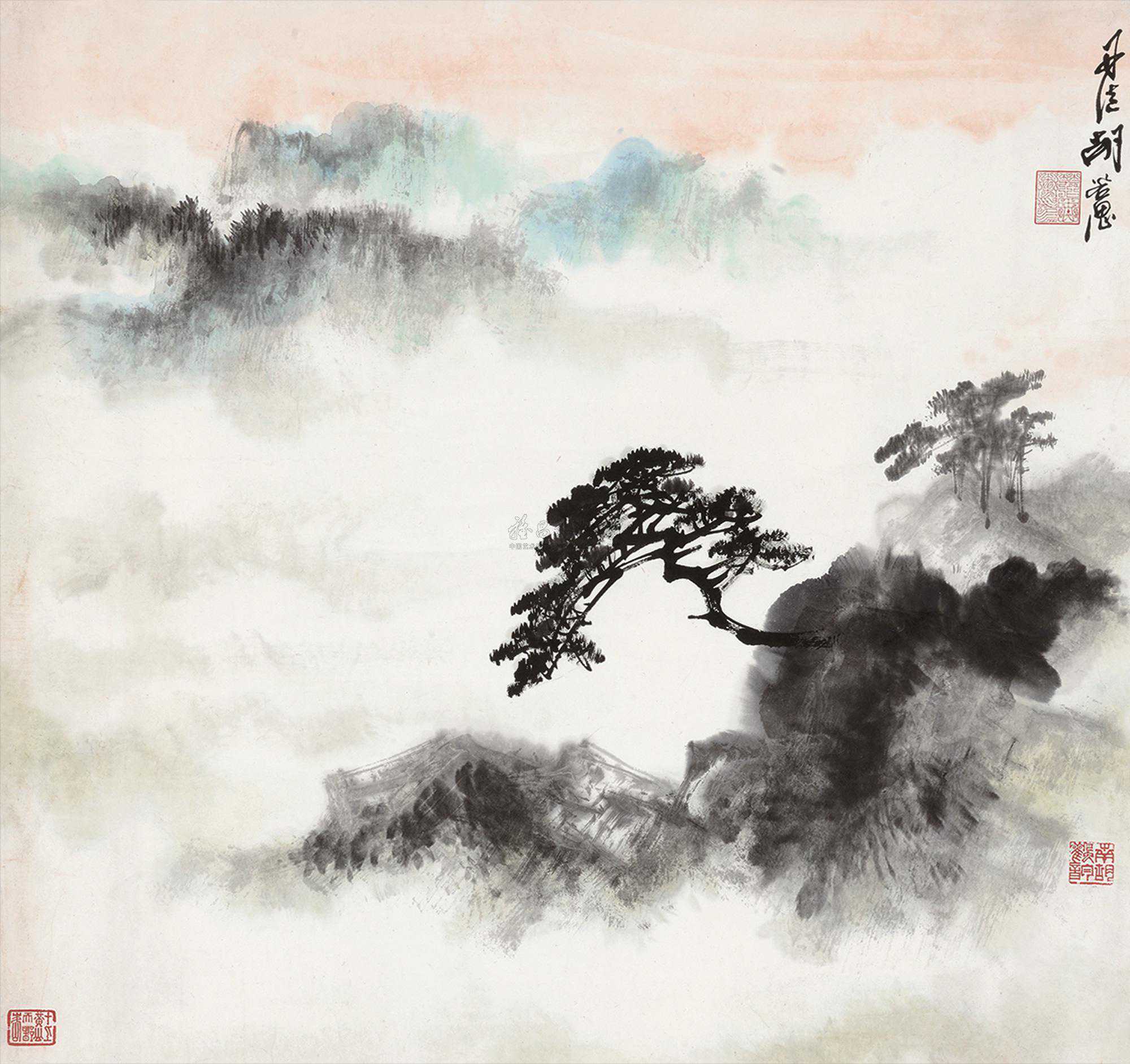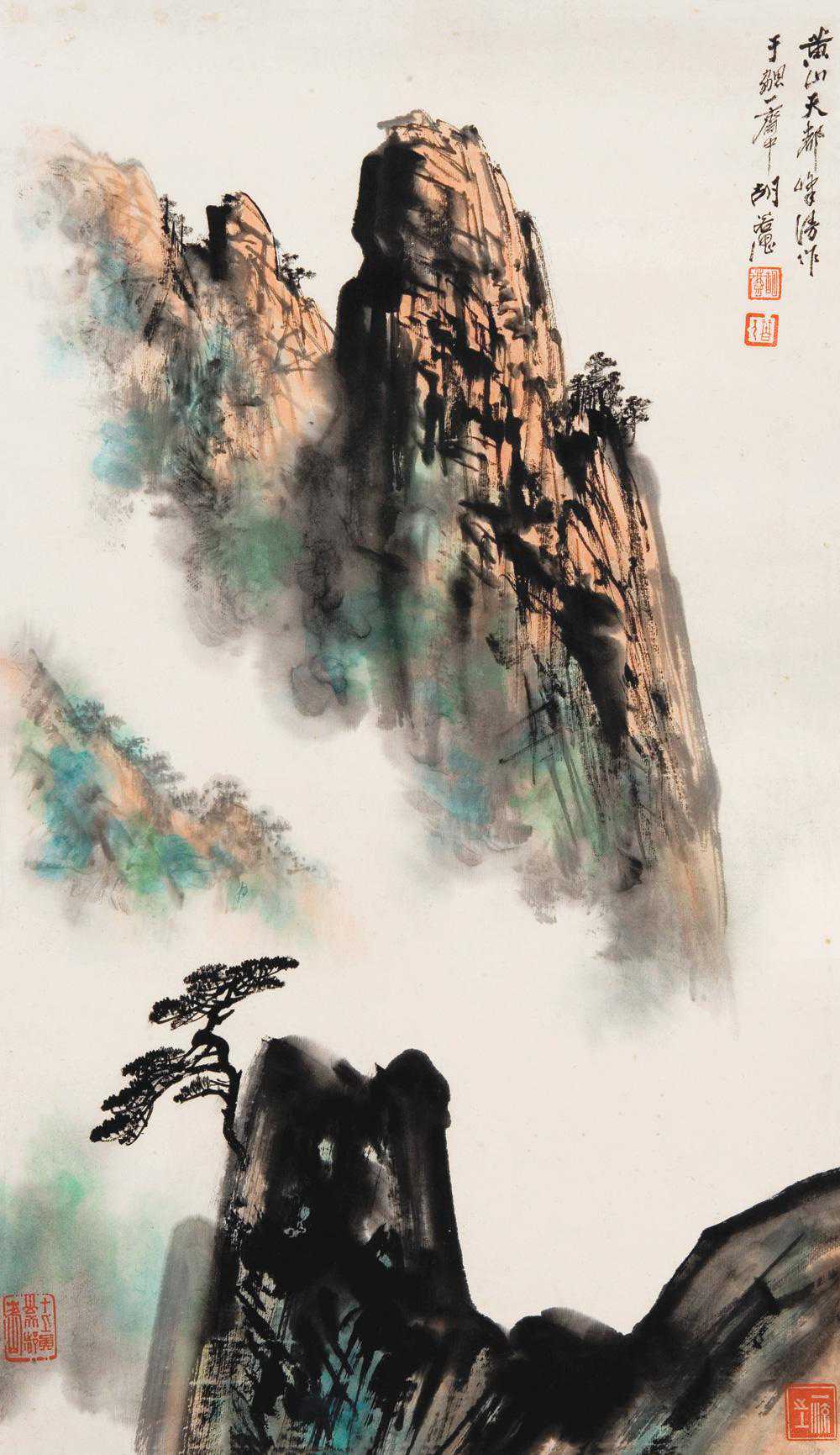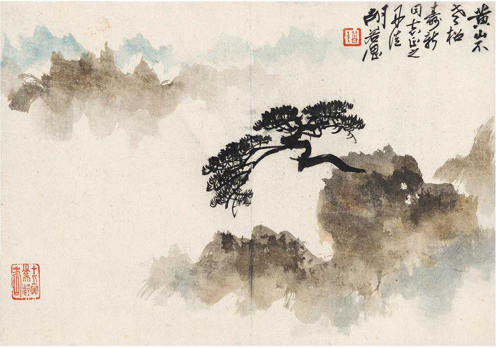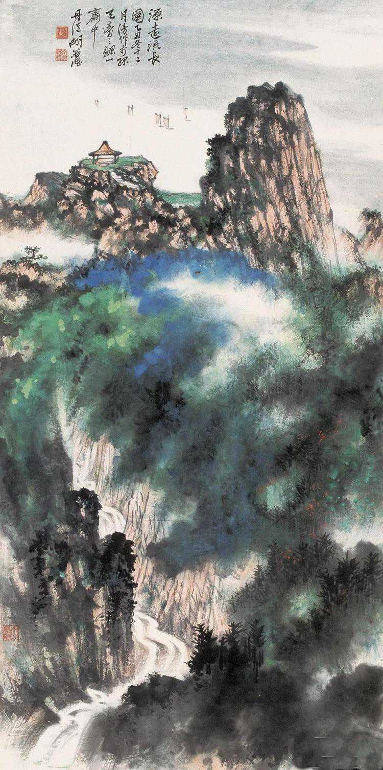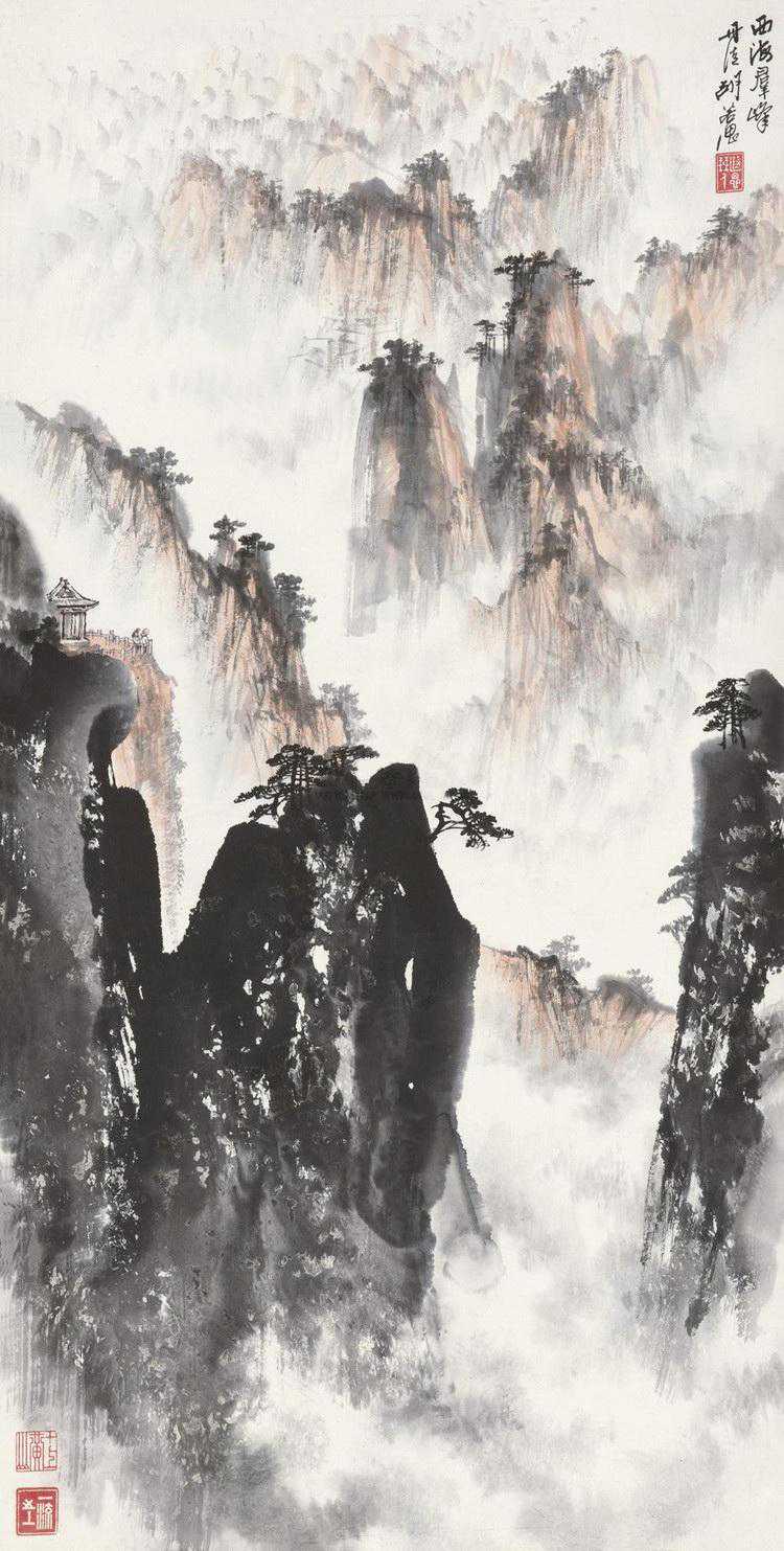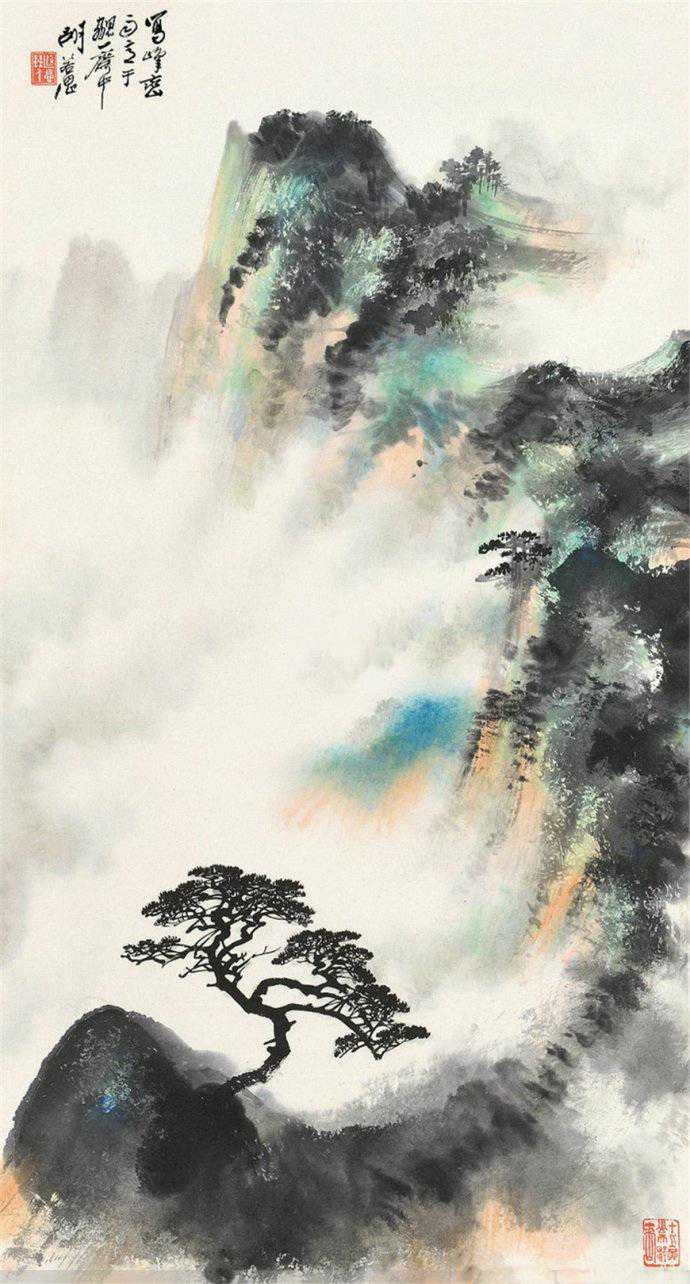 胡若思以黄山为表现题材的系列作品,普遍带有一种舒朗的快意。此图也是表现晴朗的黄山。群山在雾中隐现,而雾淡薄轻盈,倍显清丽。胡若思的山水画创作已不是纯粹的传统表现手法,显然接受了一些外来因素的影响,从而使山之境界更广,气势更大。从近百幅绘作来看,胡若思基本承袭了张大千的笔法与神韵,工笔、写意、青绿、泼墨无所不精,堪称罕见的多面手,而其中又以工笔和写意巧妙的融合之法,最为让人称奇。