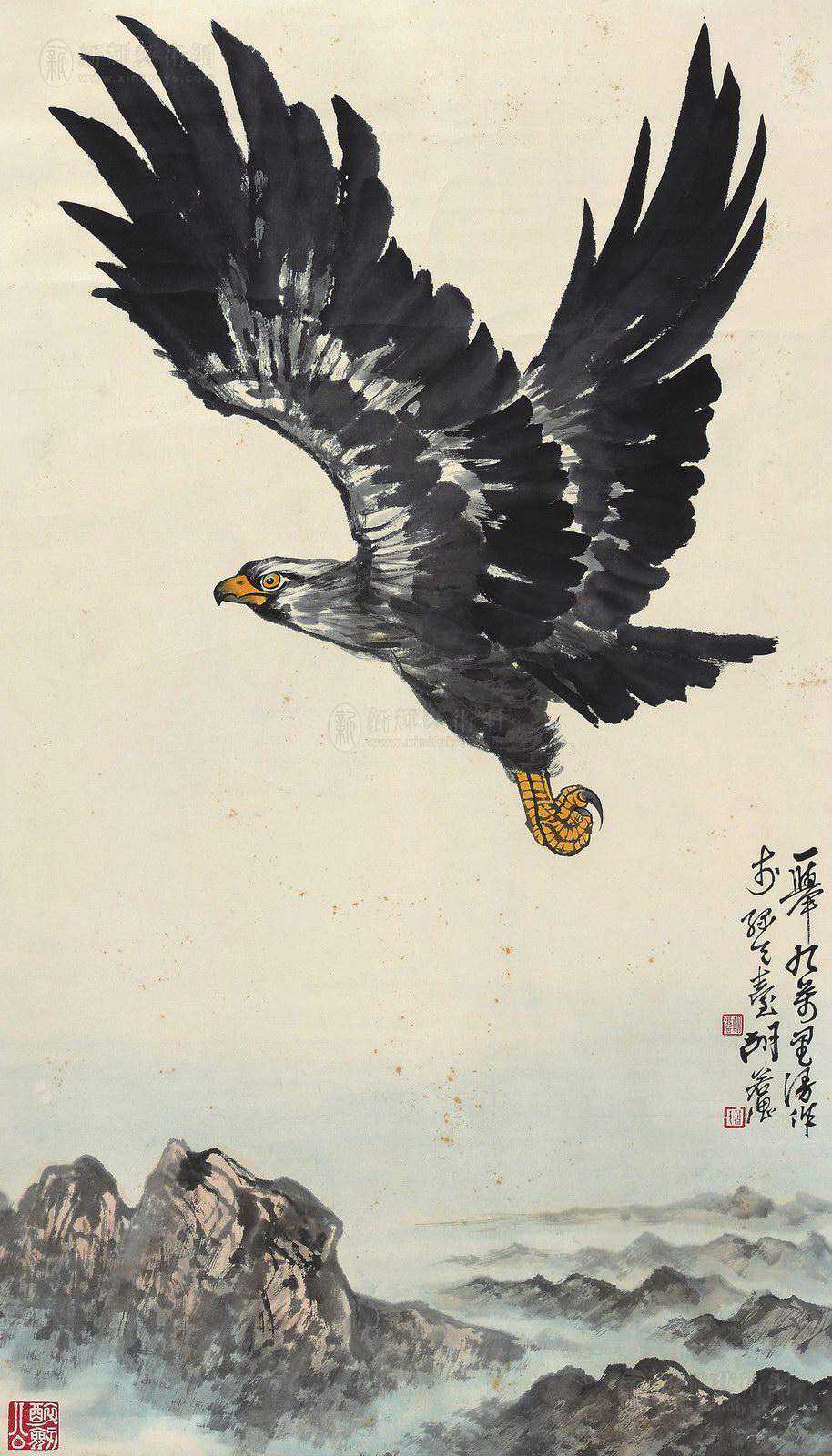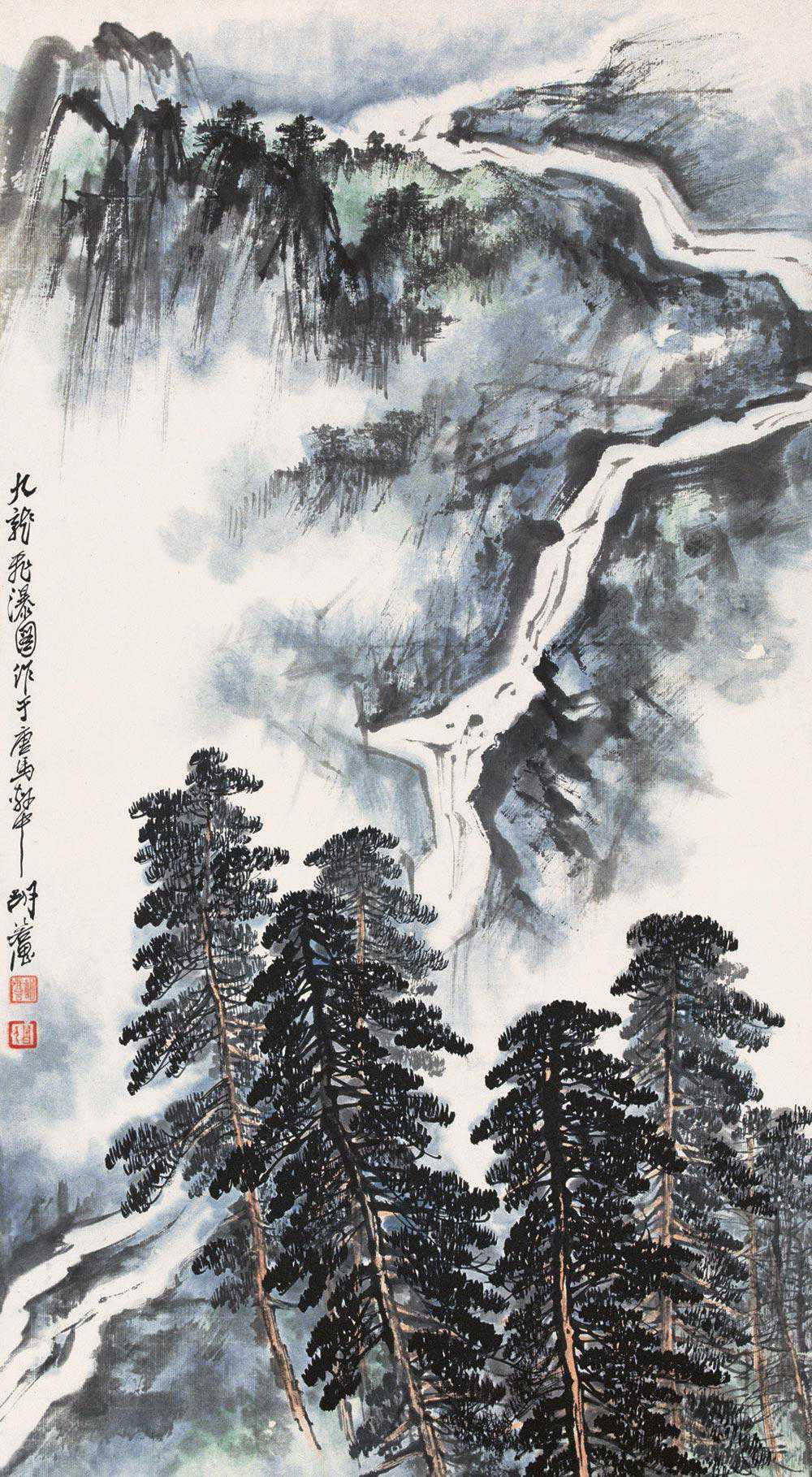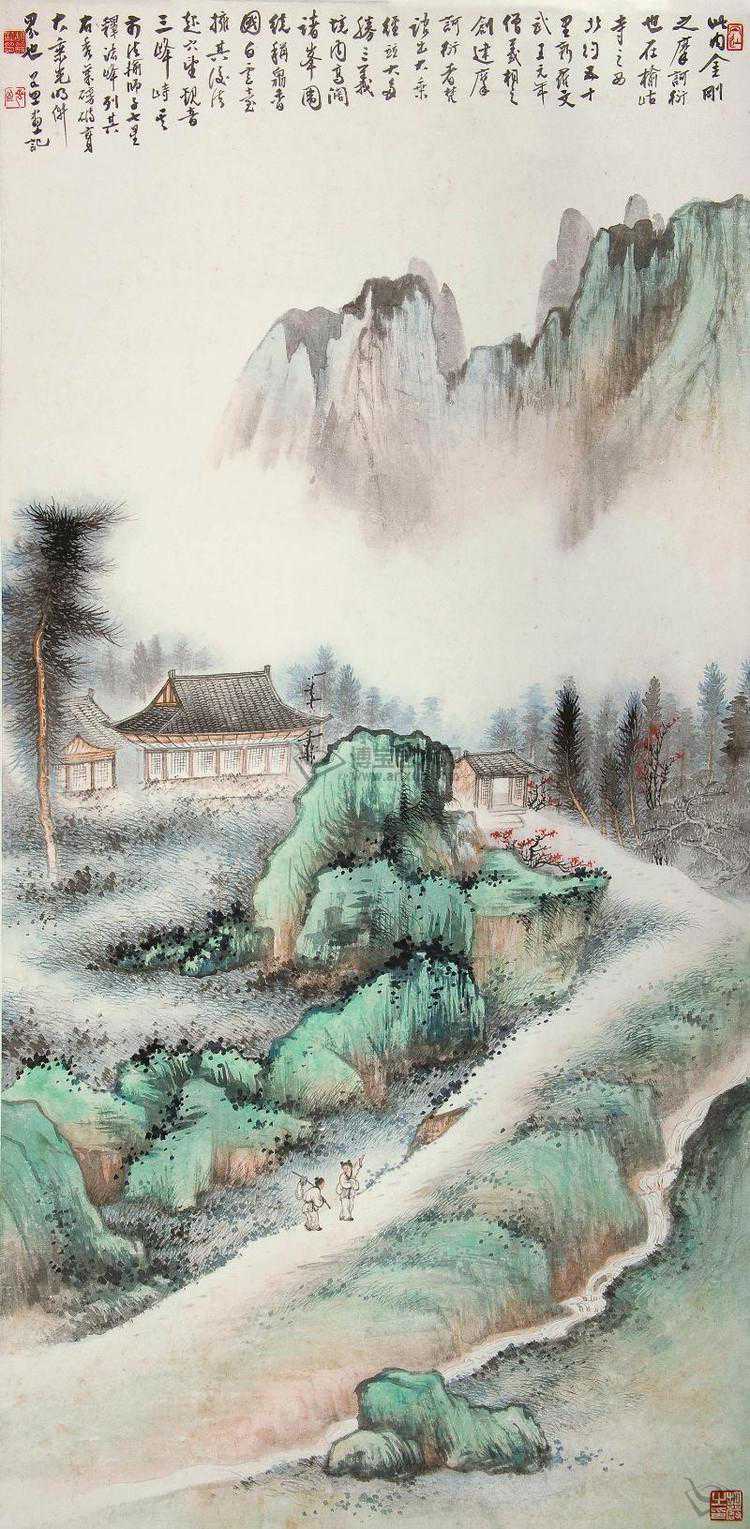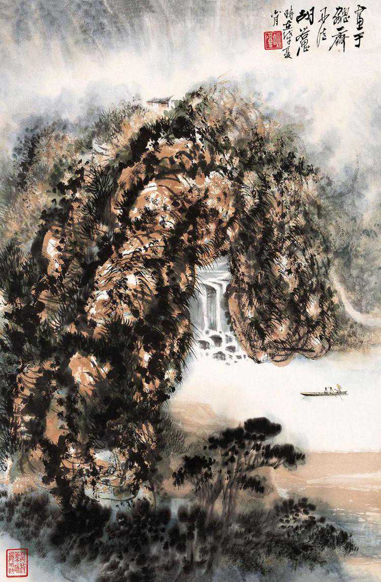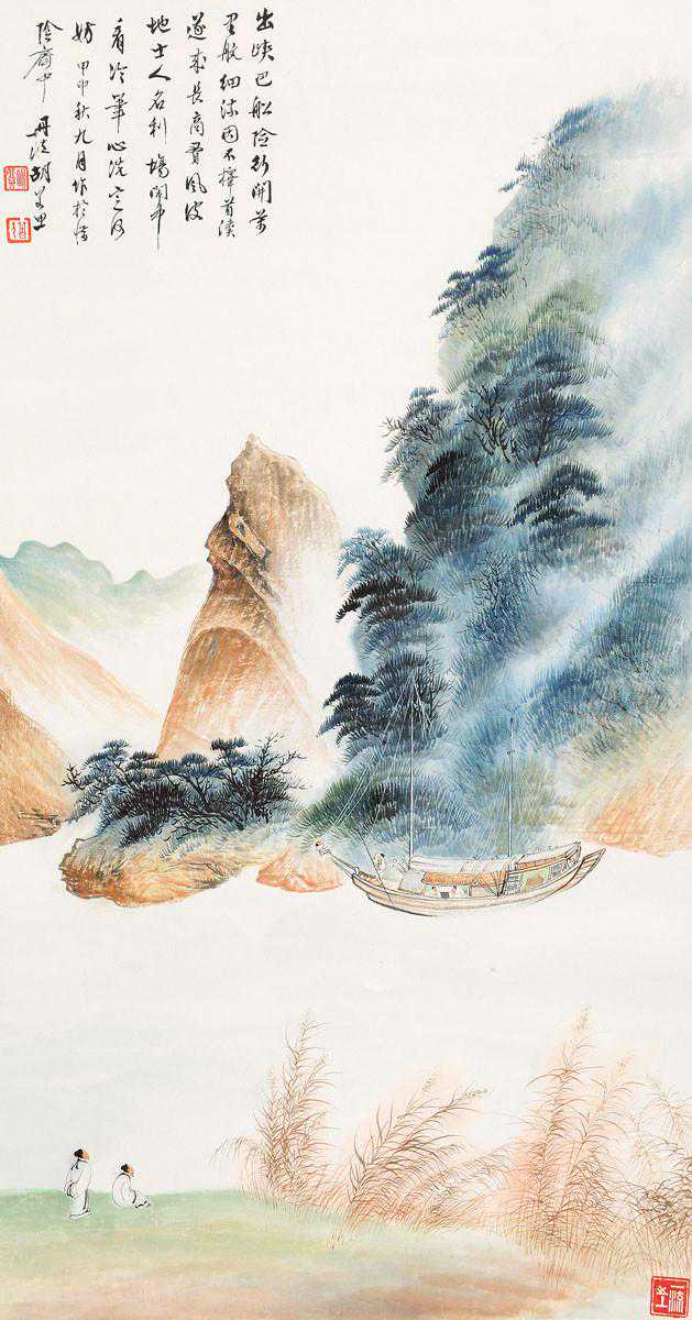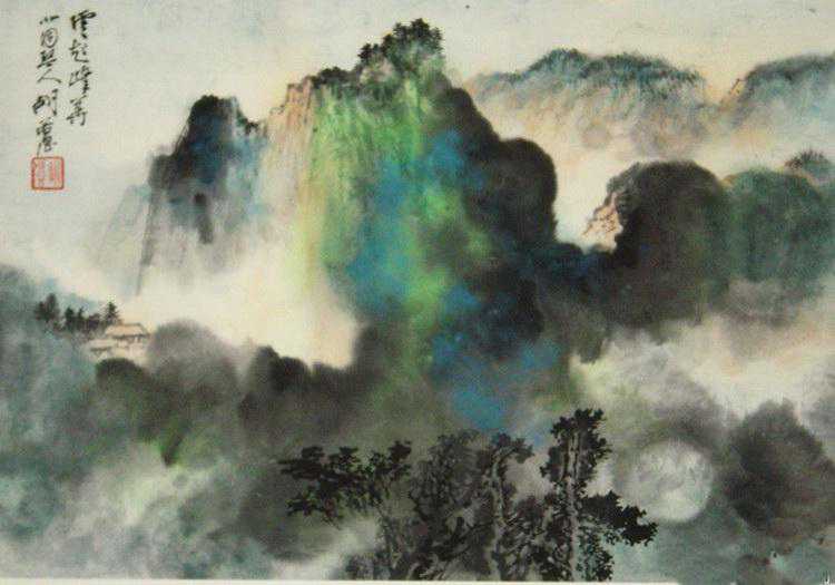 胡若思以黄山为表现题材的系列作品,普遍带有一种舒朗的快意。此图也是表现晴朗的黄山。群山在雾中隐现,而雾淡薄轻盈,倍显清丽。胡若思的山水画创作已不是纯粹的传统表现手法,显然接受了一些外来因素的影响,从而使山之境界更广,气势更大。从近百幅绘作来看,胡若思基本承袭了张大千的笔法与神韵,工笔、写意、青绿、泼墨无所不精,堪称罕见的多面手,而其中又以工笔和写意巧妙的融合之法,最为让人称奇。
