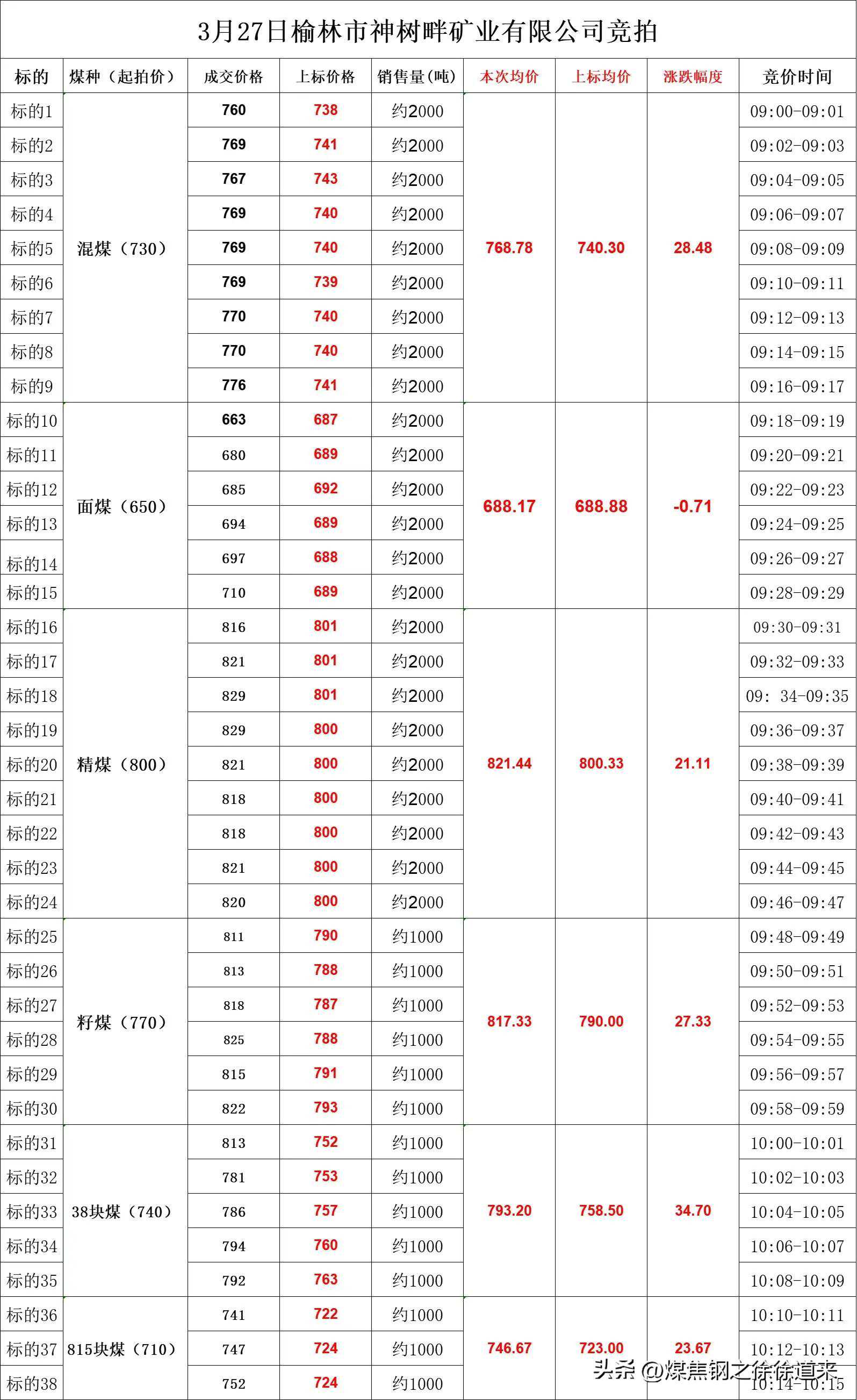 经总经理办公会议研究决定,汇能长滩露天煤矿从2024年3月27日11点起(以空车过磅时间为准)价格执行如下: