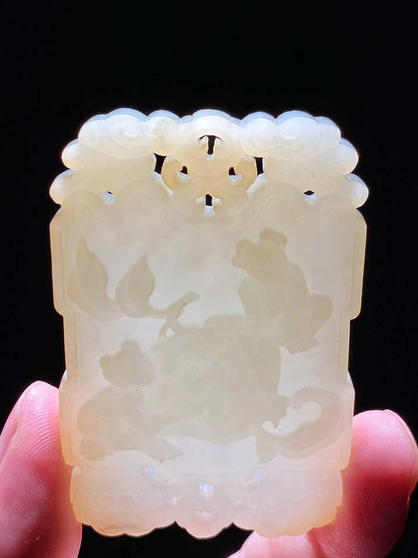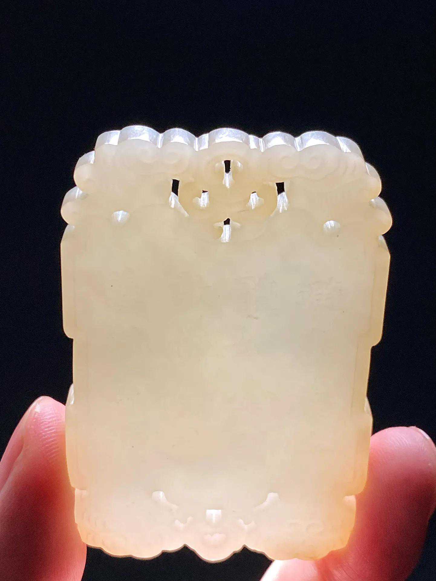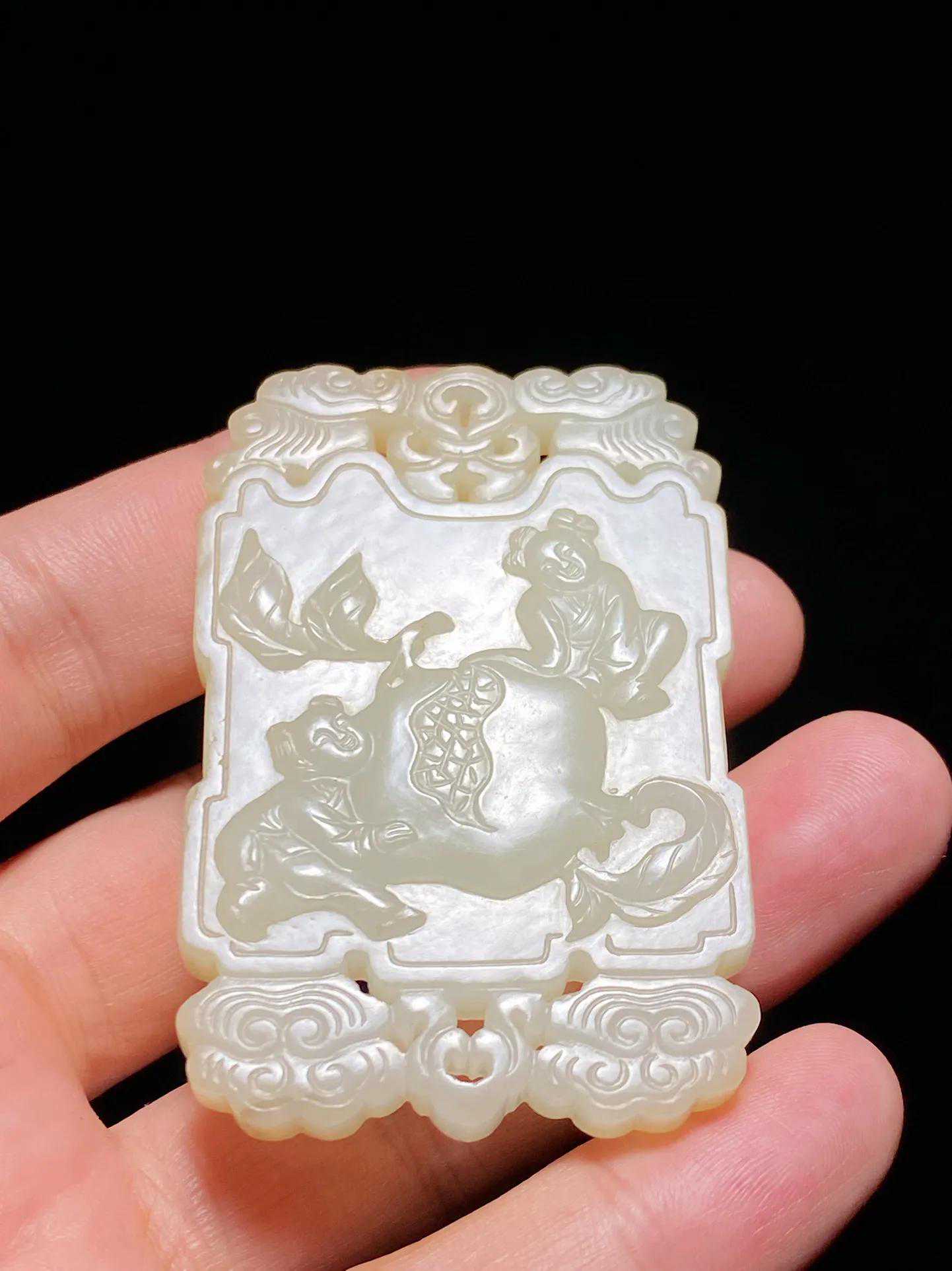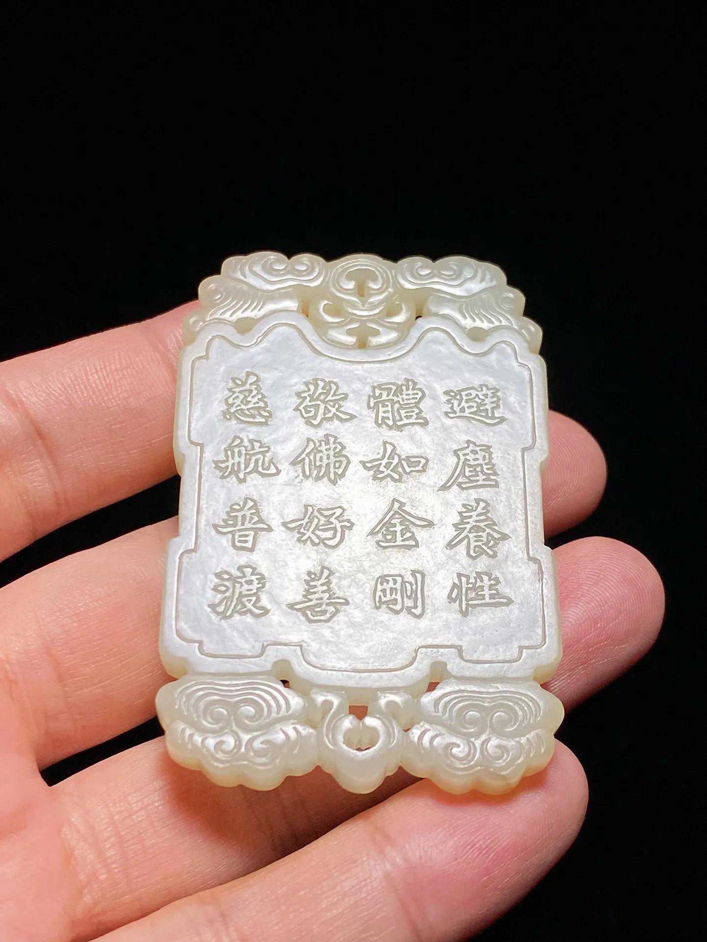 清中期和田玉籽料白玉榴开百子诗文牌玉珮长4.2宽0.8高6.4厘米重49克牌白玉质,玉色细腻光润,抛光精良,莹润光亮,玉牌呈长方形,牌首雕如意纹,中间有穿孔。正面浮雕童子石榴,石榴果实饱满,枝叶苍翠,两个童子,喜笑颜开,表情生动,衣纹流畅,衣袖堆褶,蕴含榴开百子、多子多福的吉祥寓意。背面琢“避尘养性,体如金刚,敬佛好善,慈航普渡。”字体如行云流水,潇洒自如。中国自古就视石榴为吉祥物,以之为多子多福的象征,古人称石榴“千房同膜,千子如一”,此牌雕琢精湛,线性柔畅,抛光细腻,立意甚佳,以精美构图寓意子孙们枝繁叶茂,代代相传,家族兴旺,材美工精,独具匠心。