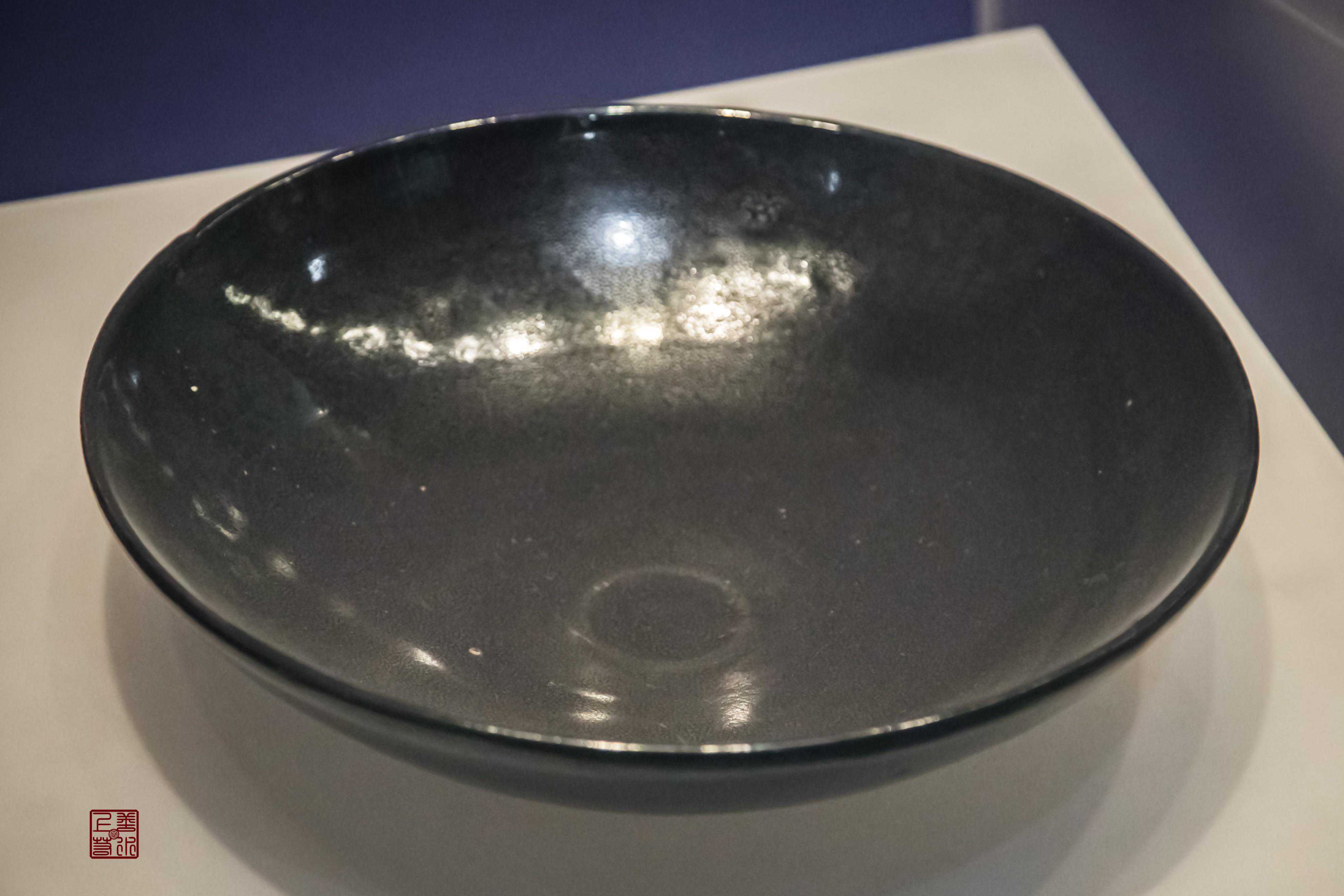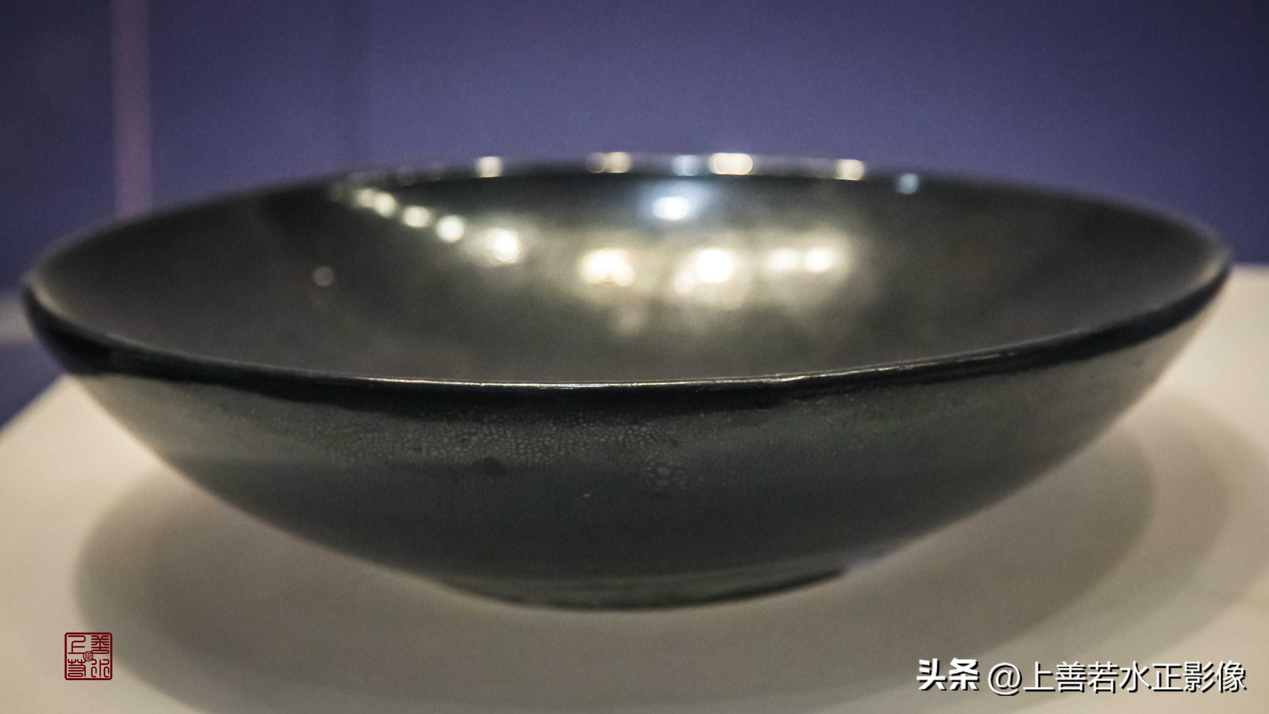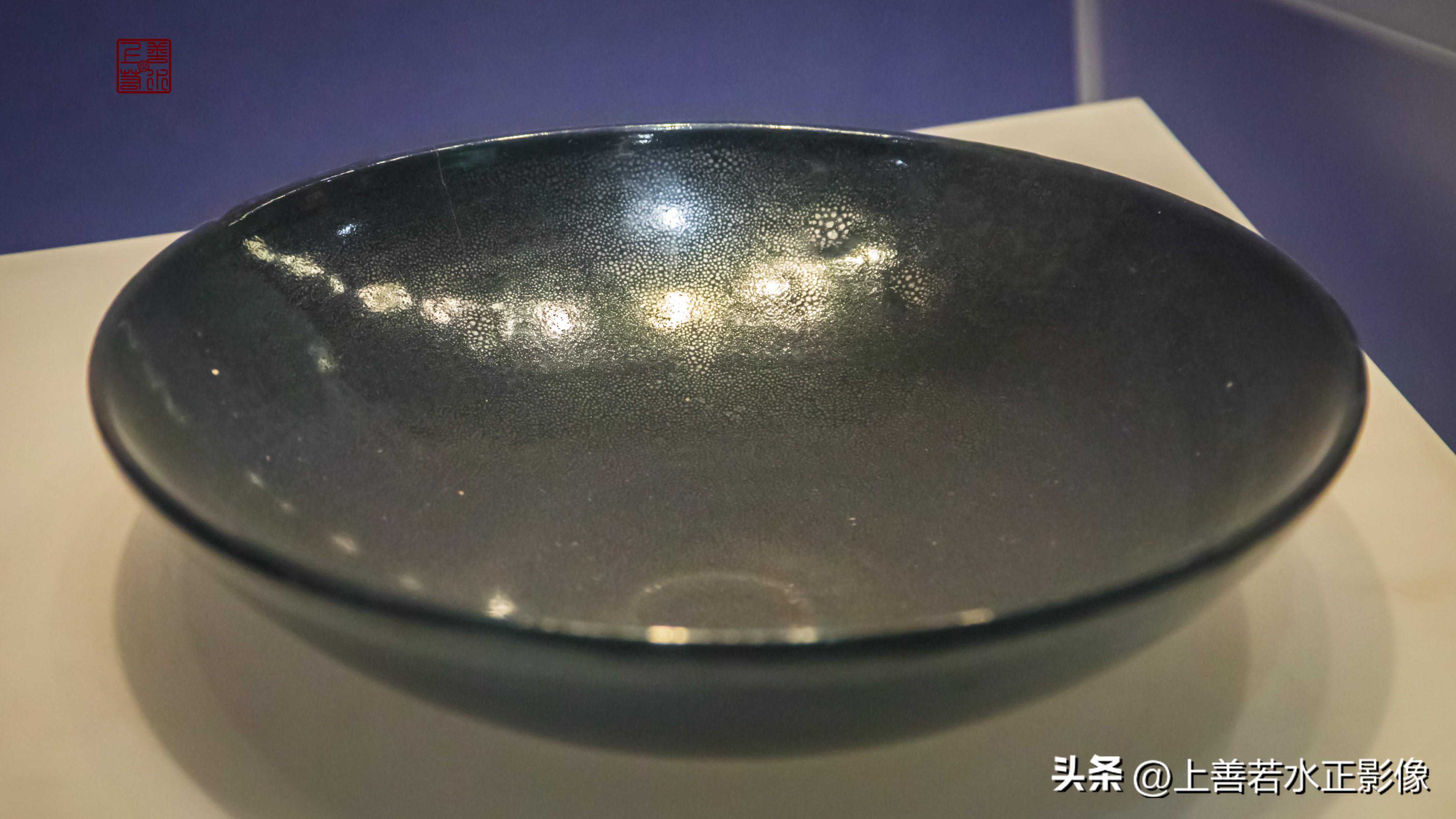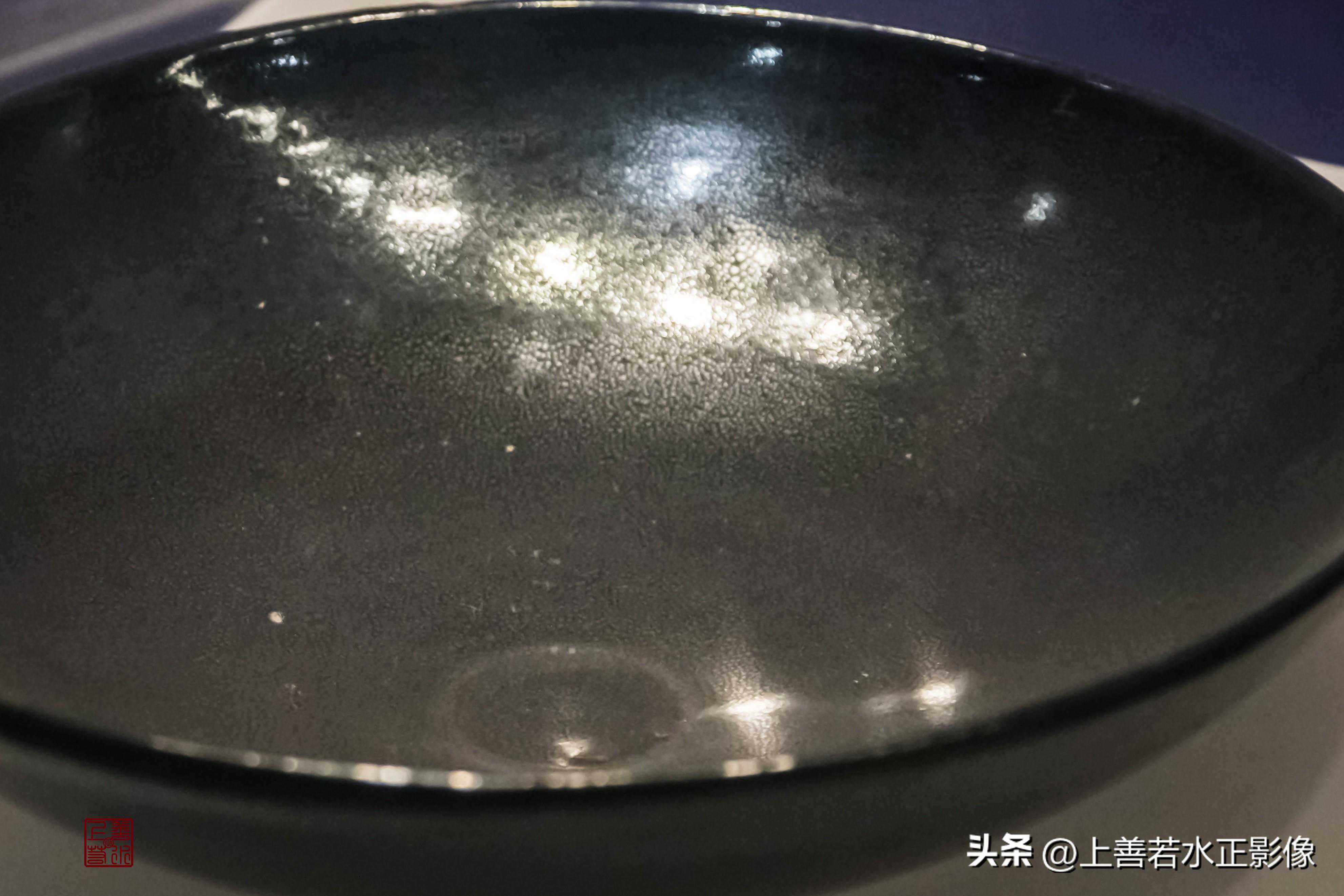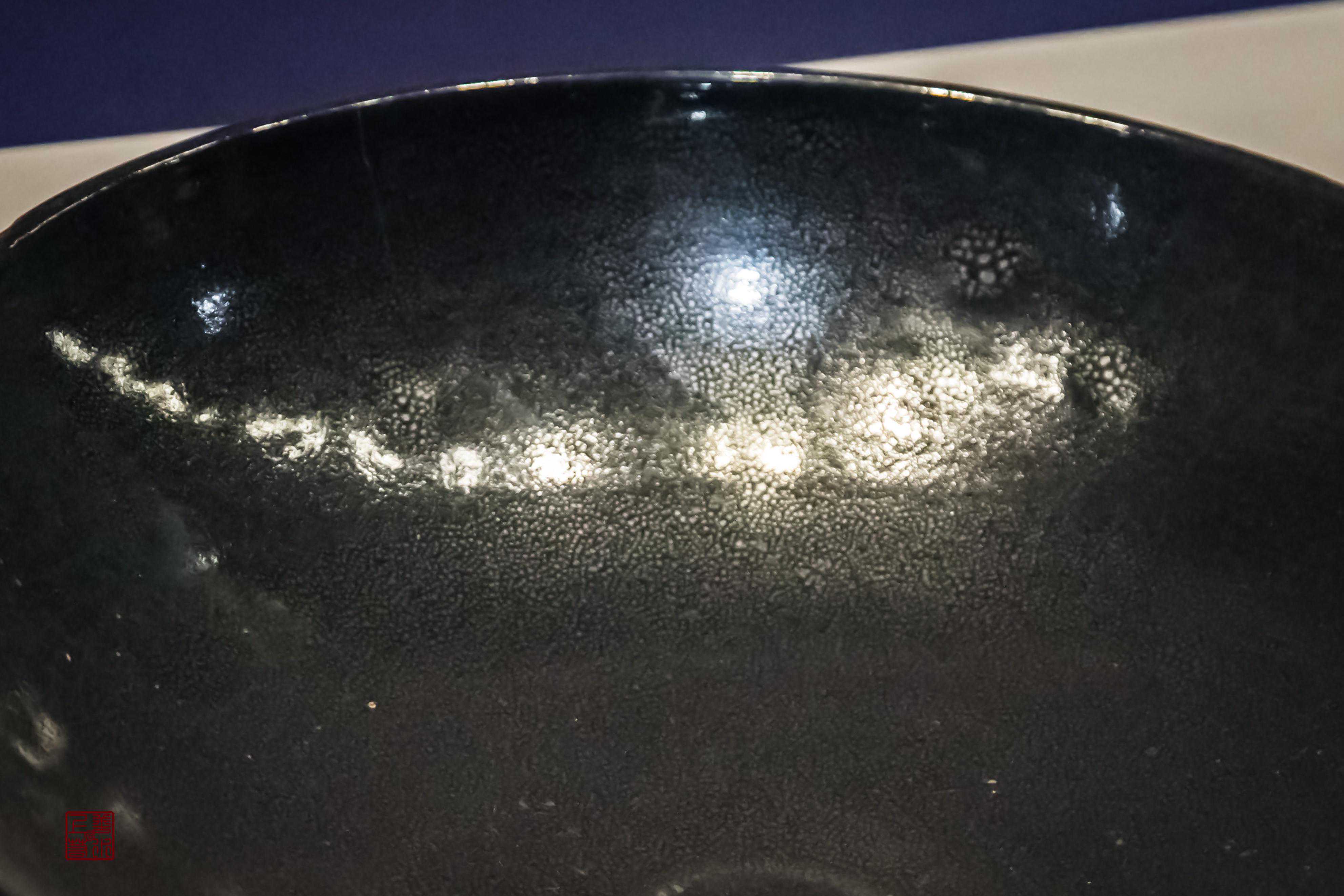 相传,这只黑釉油滴碗,盛茶闪金光,盛水闪银光,映日而视,光彩夺目。碗内闪闪的银光,如今依然清晰可见。