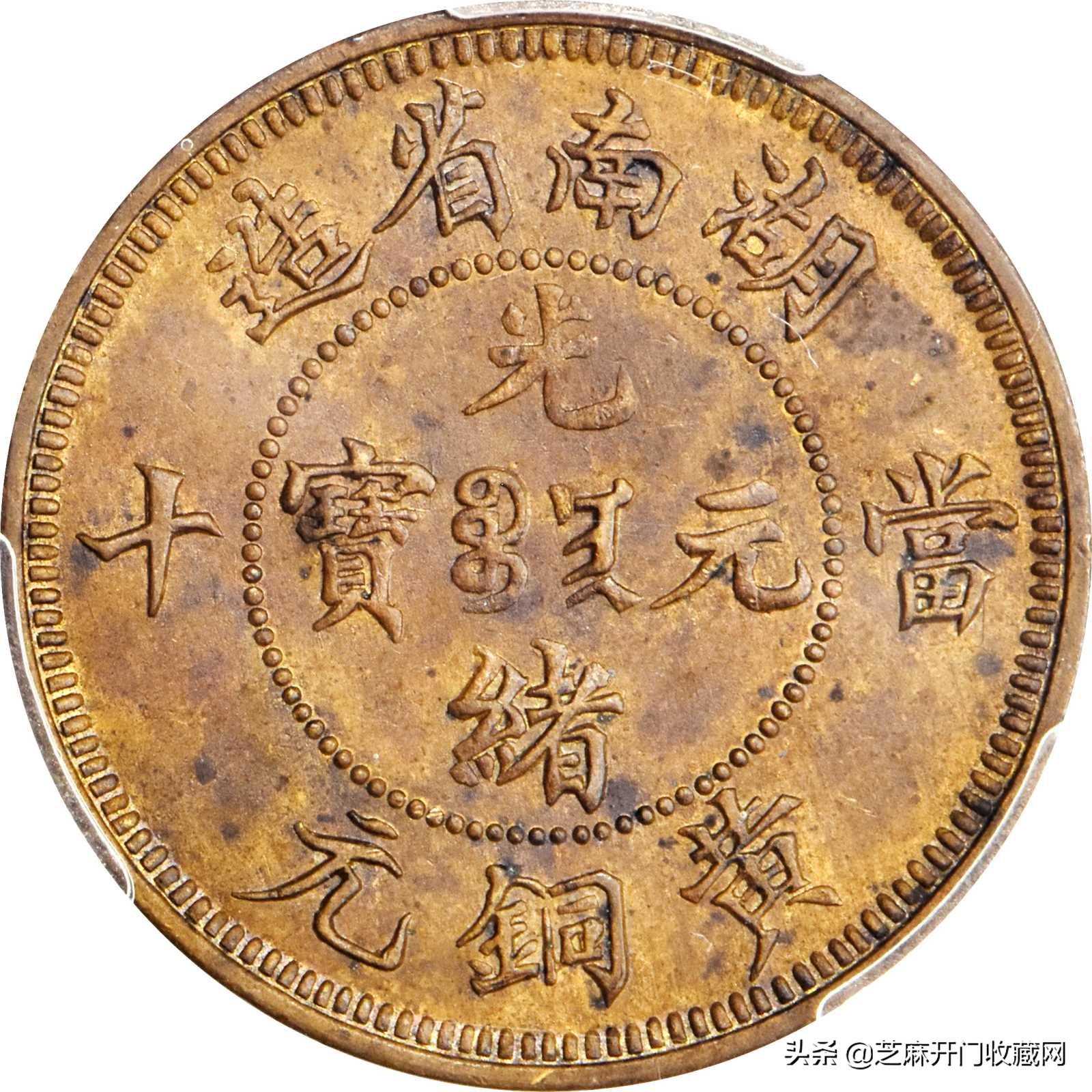 湖南省造光绪元宝黄铜元当十德制圆点花PCGSSP62,估价:USD3000-4000,成交价格:USD21600