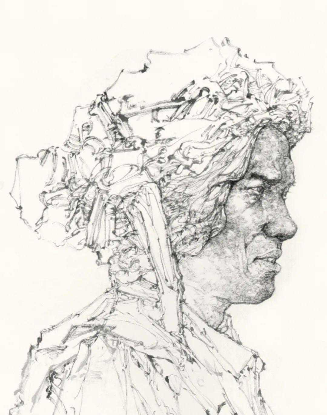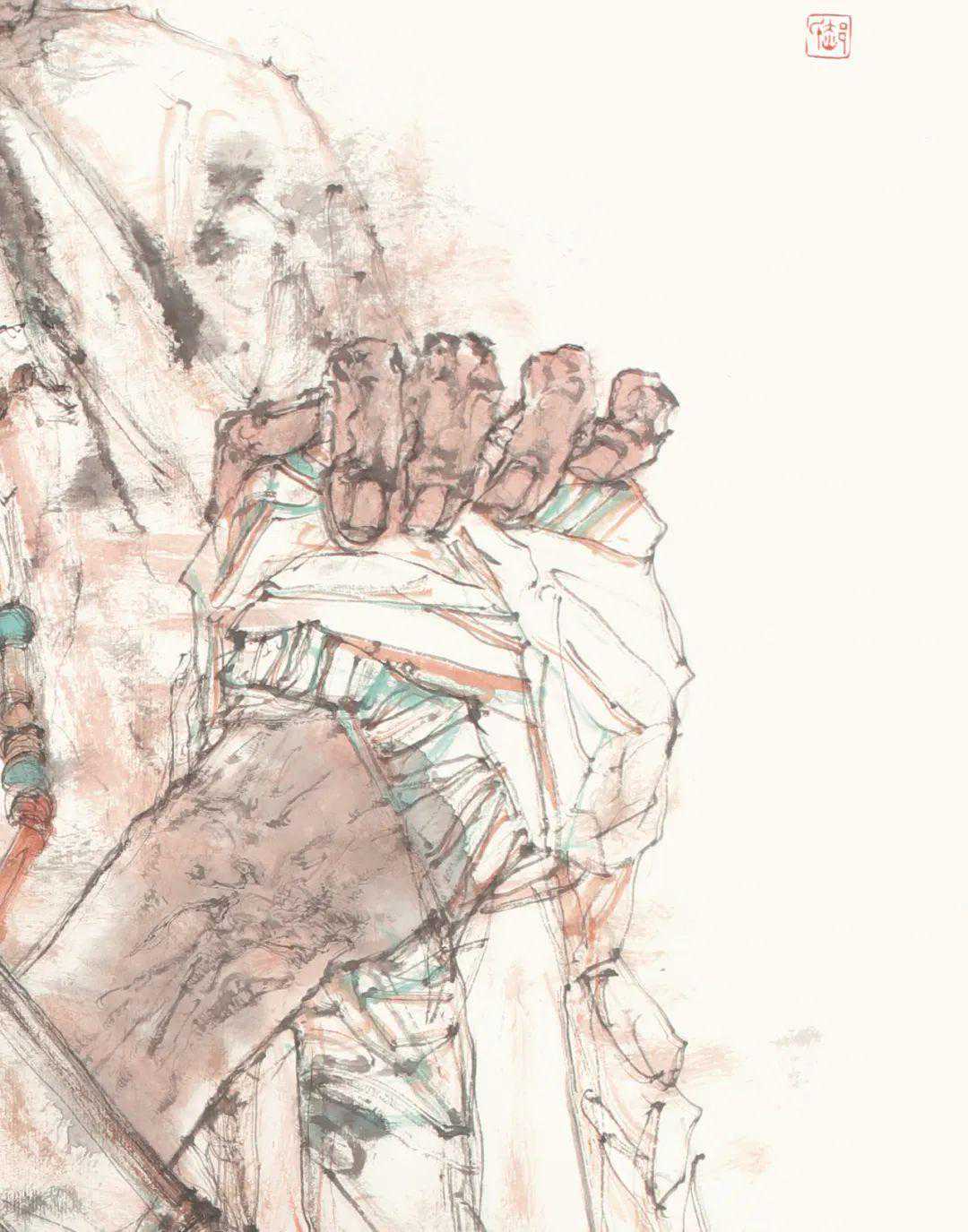 意笔白描2这张作品亦是以少数民族的形象为主体塑造,人物的动势较大,形象特征颇有画味。头部与手部的处理相对深入,服饰的处理着重线的节奏韵味,提炼出主体特征,放掉多余的细节。绘制过程应当是在尊重对象的同时主观提炼,少数民族的服饰有时候较为复杂,细节众多,在工笔画人物画中多有体现,但作为写意人物画则需进行部分取舍方能得其韵味,同时也能体现绘者的风格样貌及内心追求。