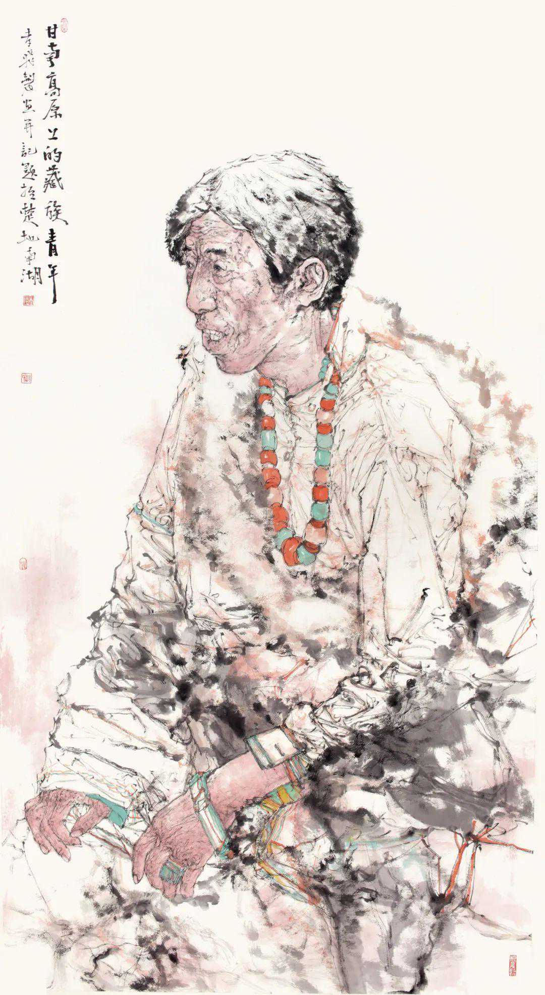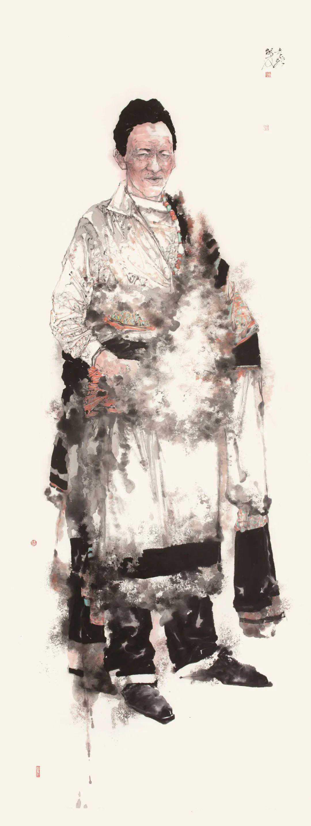 藏族男子同样的尝试在藏族题材的人物画处理中,藏族题材是水墨人物画中最常表现的题材之一。此类题材的大量作品主要是因为民族服饰的装扮及形式适合绘制感受,画面当中也是如此。因此大量的民族题材不断地被艺术家们用来创作,相对容易出“效果”,画面较丰富。这幅作品较之前的民族题材创作有一些改变,同样地加强了“黑色”墨块在画面中的分布,保留下来的线性笔墨尽量保持“书写性”及“绘画感”,主客观交错运用,突出“个人特色”。