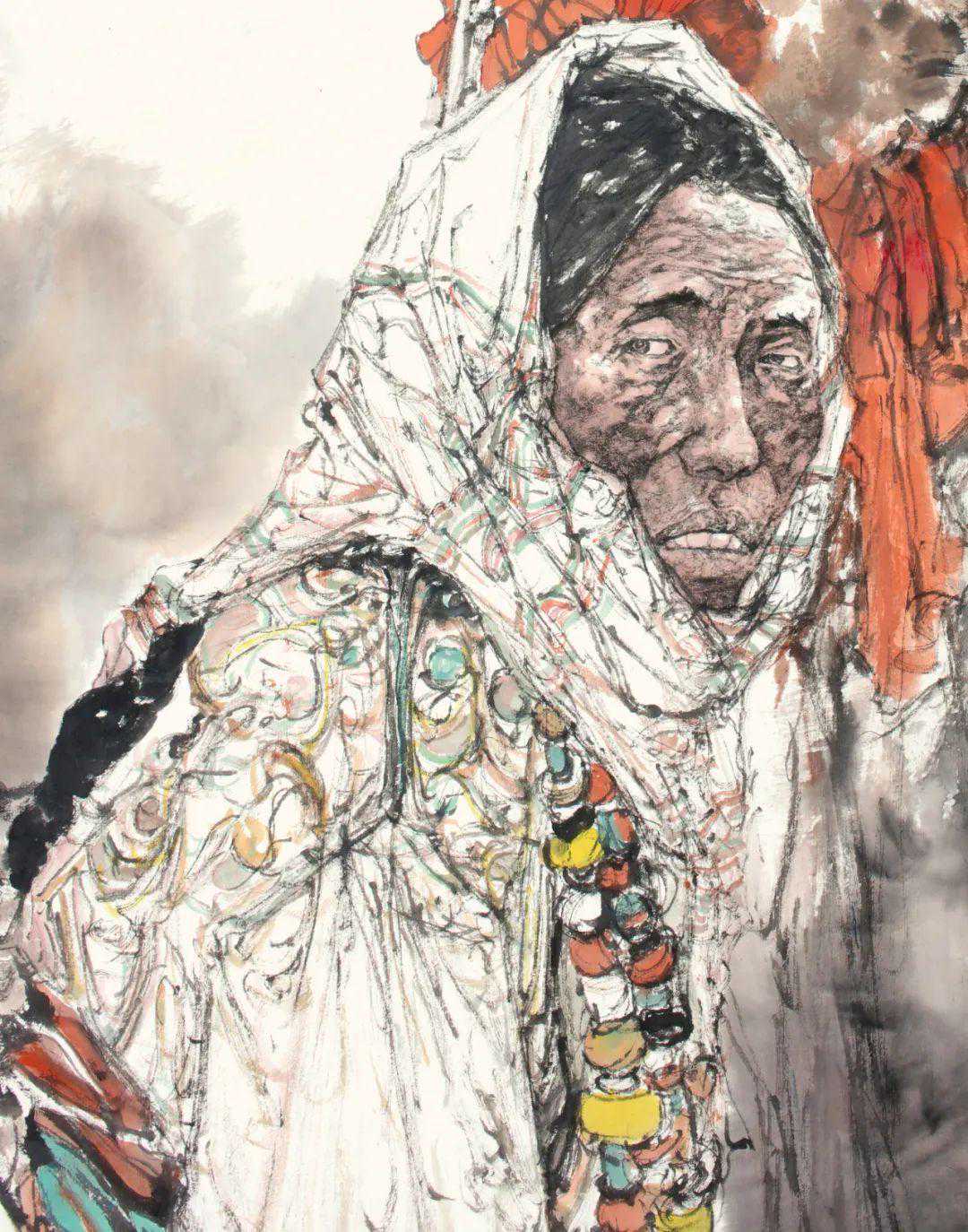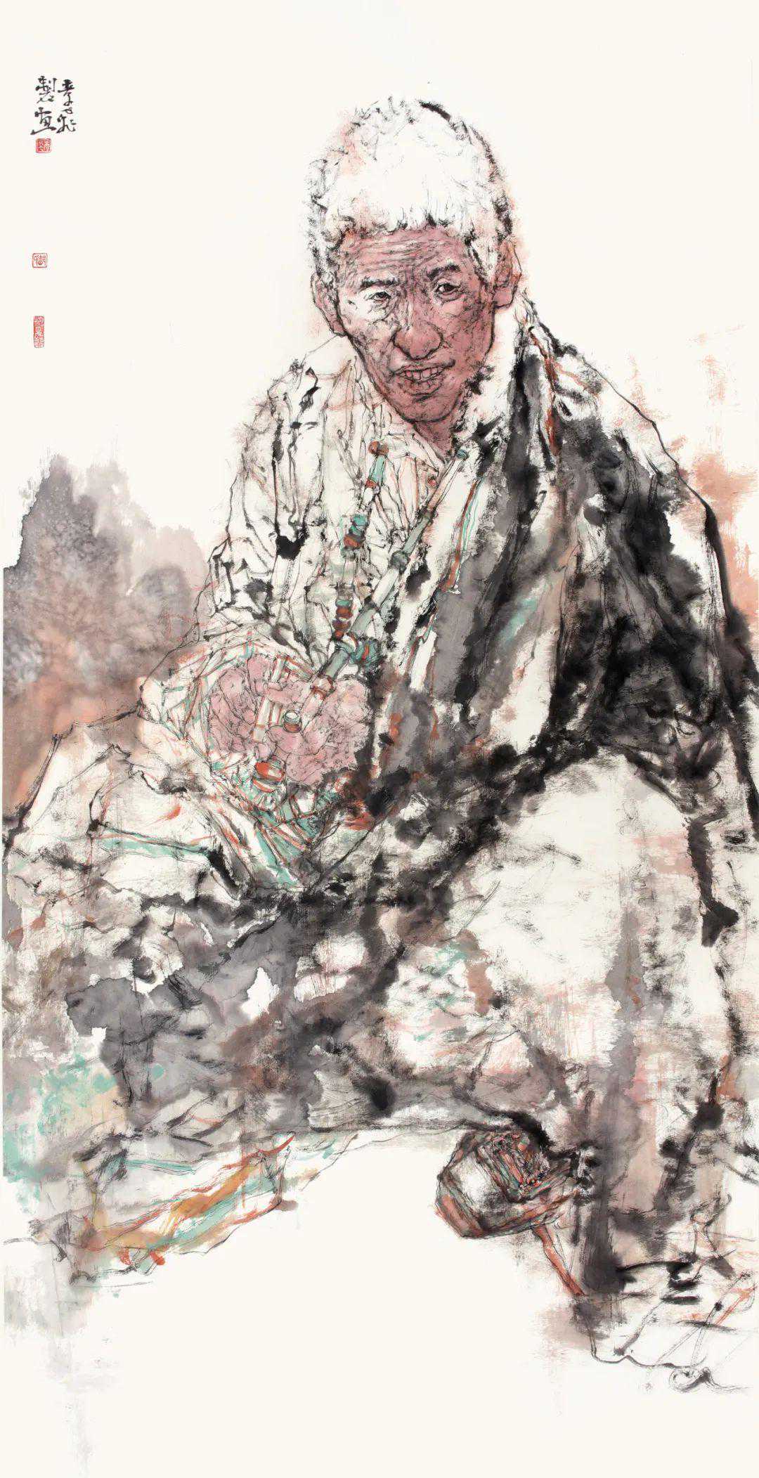 藏族老人1老人与妇女是高原上较多的形象,尤其老人的形象大多非常入画,由于民族特色藏族老人形象“味道”十足,在大量的作品中都有所表现。系列作品中强调了传统的用笔:中锋侧锋的大量使用,同时辅以淡墨块处理,增加画面的节奏感;设色方面以赭石、曙红、胭脂等调合突出染法的合理使用,增加了人物的苍桑感。