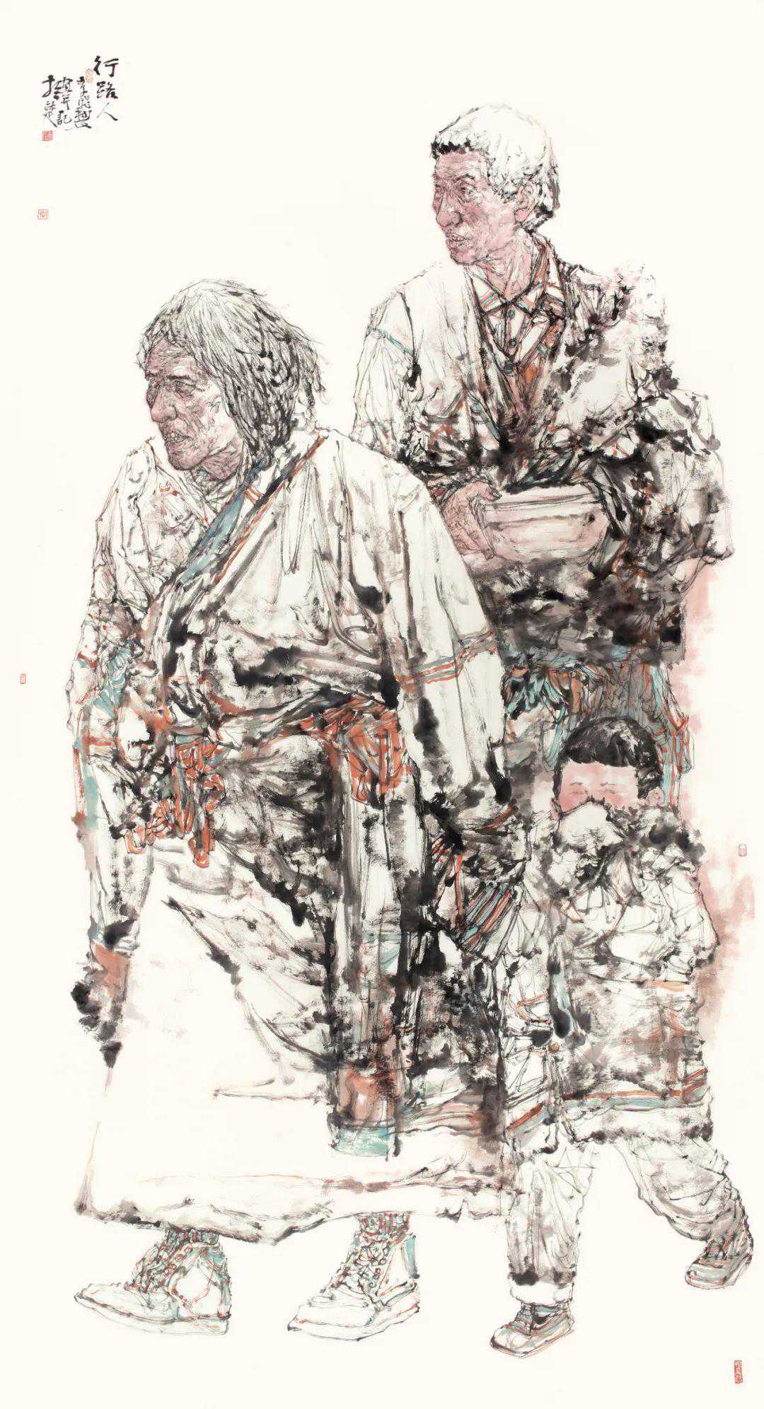 归途归途这幅作品个人较为喜欢,风雪之中的藏民及牦牛的陪伴是草原上的生态之一。人物以线及墨块铺陈,牦牛以没骨画法为主,其余皆以线入画,整体作品节奏追求明快、厚重。