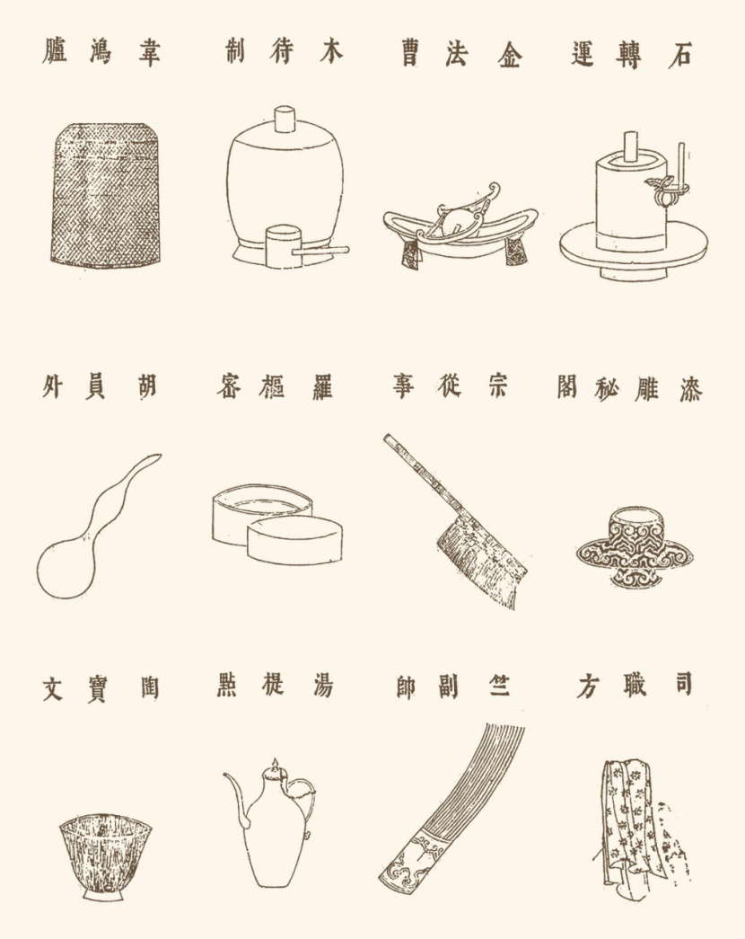 从图中可以看出,《茶具图赞》共列出12种茶具,有趣的是,作者审安老人给每个茶具不仅根据他们的材质或用途起了姓氏,还给他们封了官职,比如葫芦形“胡员外”用来量水,石头做的茶碾转来转去叫“石转运”,注水用的壶叫“汤提点”。“汤”为热水,“提”为提起,“点”则是点茶之“点”,连起来即是“提水点茶”之意;而“提点”又为宋代官职,含“提举点检”之意。