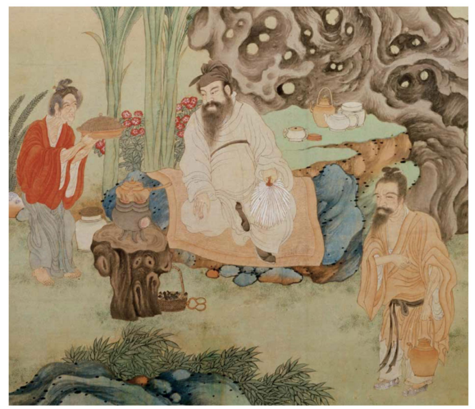 主人坐在藤墩上指挥仆从们穿梭服侍。将所藏画轴古瓷呈上,以供宾客欣赏。岸边有两位文士,丝毫没有受到嘈杂环境的干扰。在专注翻阅品评,完善画册。一名童子正在屏风后以风炉烹茶,一侍女托盏于宾客身后。明中期以后,这类以吟咏诗赋,鉴赏书画,古玩以及品茶、品香、弹琴等为主要活动的聚会颇为盛行。中国茶道融合了体味自然、养廉雅志、兴邦治国等多重境界,是一个万象合一的综合体。