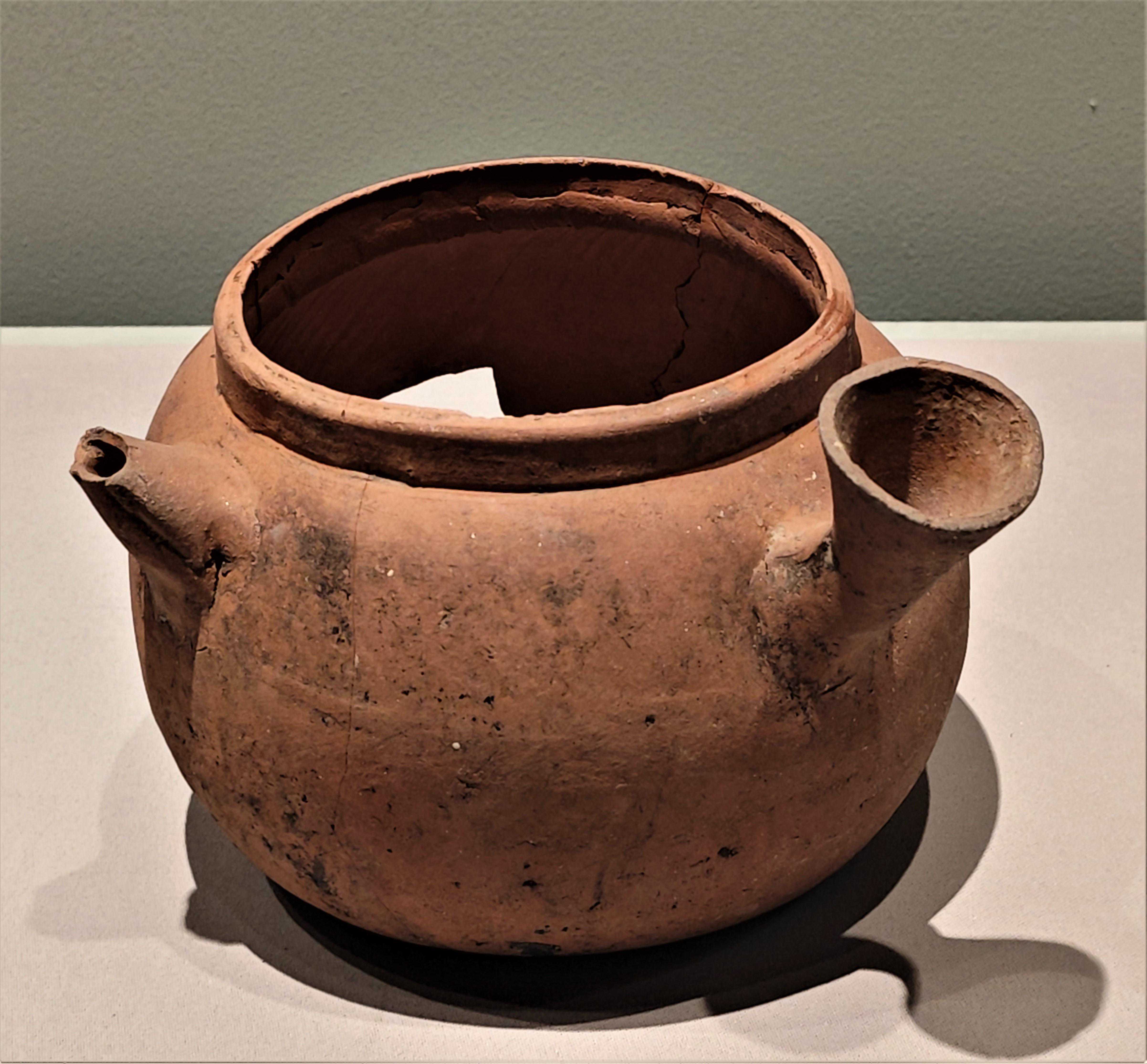 这件出土于江苏南京明代私立太监吴经墓的紫砂提梁壶,制作年代不晚于嘉靖12年(1533年),是目前所见年代可考器物中时代最早的紫砂壶。其弧形与同一时期画家王问所绘《煮茶图》上的提梁弧造型一致,互为对照。