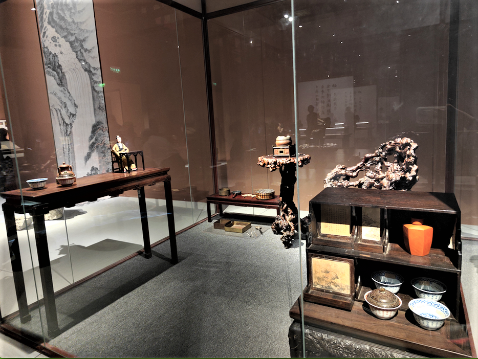 弘历观月图以康熙时期冷枚绘《赏月图》为范本,于画面右侧加绘茶架。画中弘历作汉族士人装扮,赏月、饮茶。童子手捧朱漆茶盘,上置青花盖碗。旁侧的双层斑竹茶架中盛放有各类茶具。在现场可以看到画中文物的“同款”: