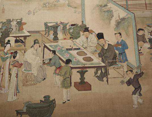 在宫廷画师为乾隆皇帝绘制的《是一是二》图中,弘历作文士打扮。端坐茶舍之内,手持书卷,目视清茶,身边放置着上古玉璧、商周青铜器、青花瓷器、善本书画等古物珍玩。