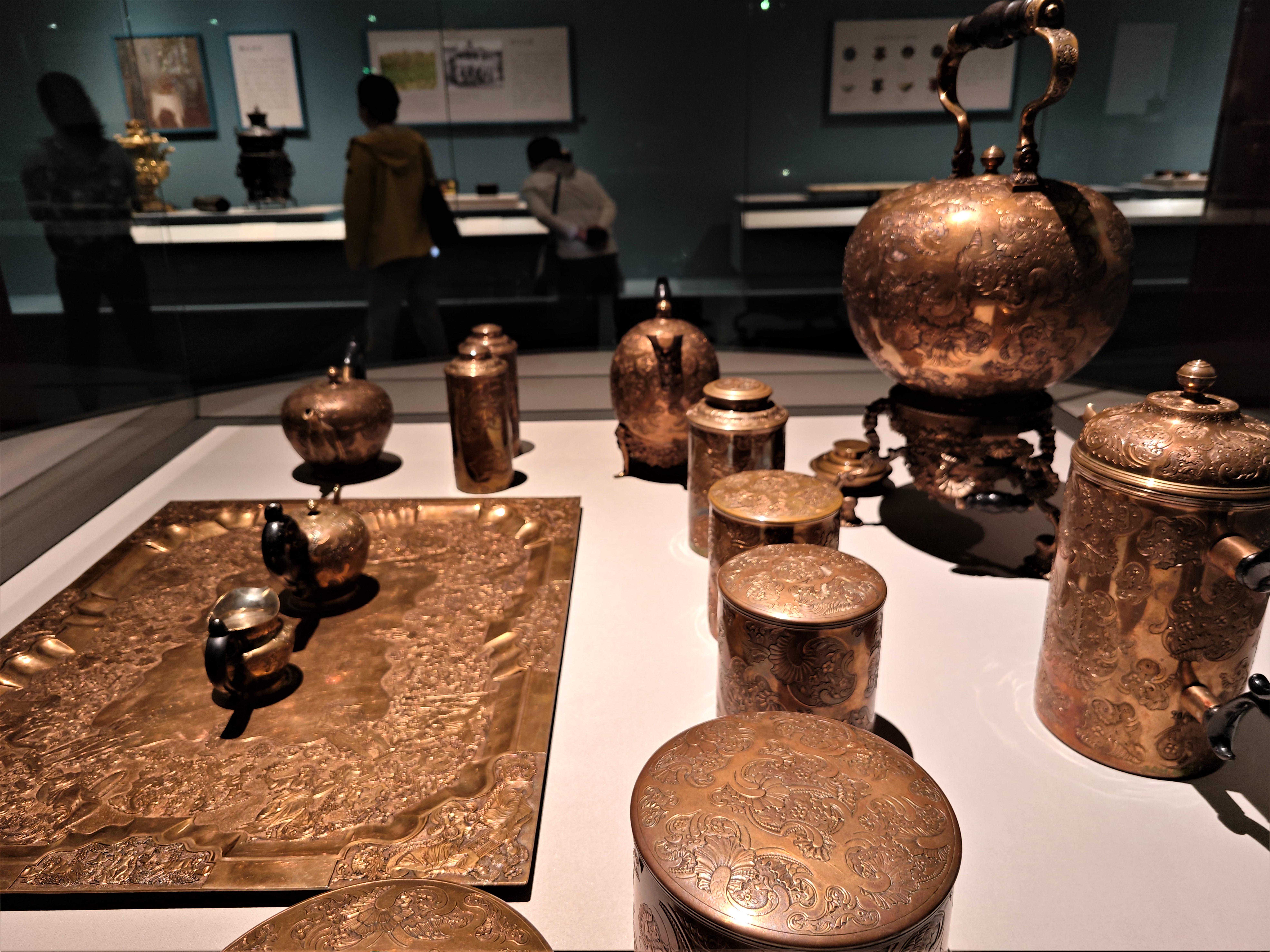 展览中还有来自英国、日本、俄罗斯的茶器精品,还有清代宫廷中使用和收藏的来自异域的茶器,以及由清宫造办处制作的外国风格的茶器。比如:故宫博物院收藏的日本银鸢尾花纹茶具套装、法国蓝釉描金寿字纹茶具、俄罗斯银刻花双耳六足盘,以及维多利亚与艾伯特博物馆收藏的“中国风”茶具、英国沃克斯豪尔瓷厂烧造的软瓷印花青花庭院图茶叶罐、德国麦森瓷厂烧造的红陶模印花卉纹壶、珐琅彩描金人物图杯及杯托等。