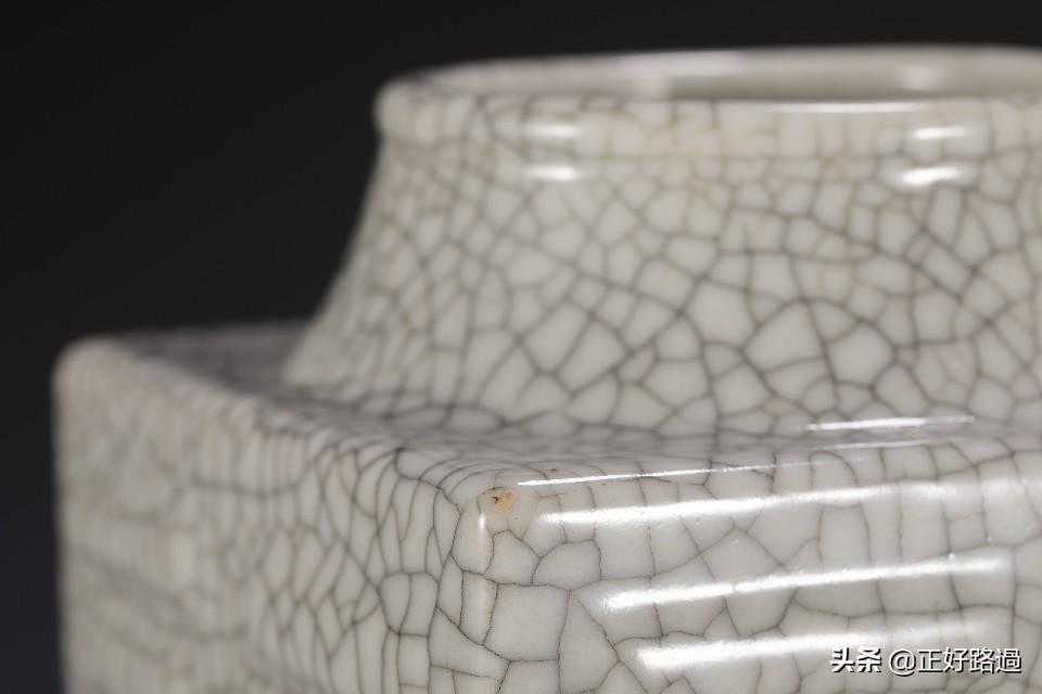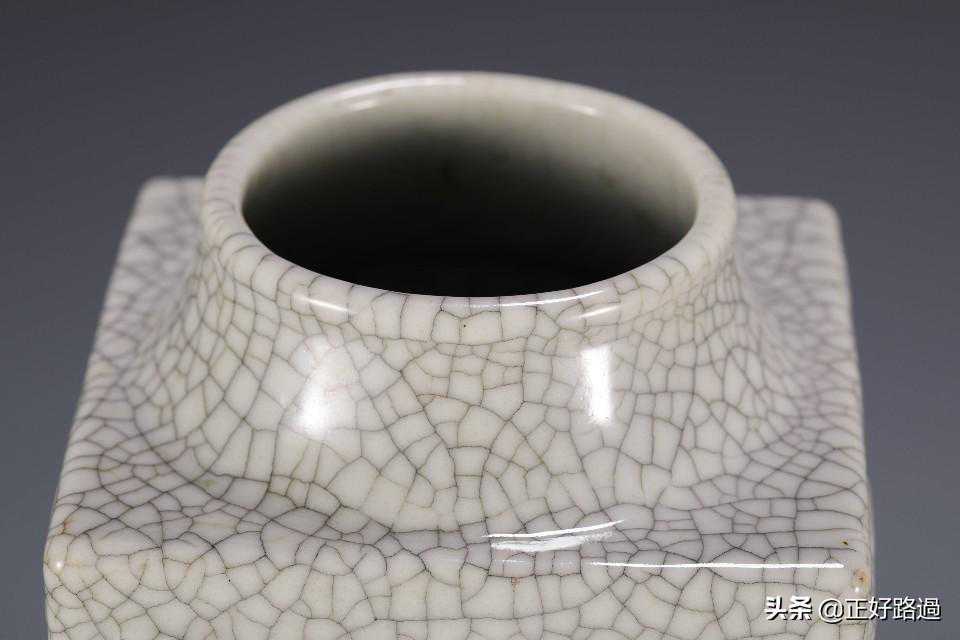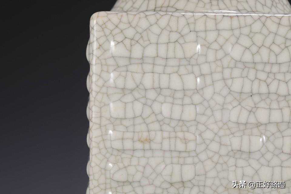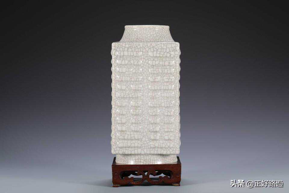 琮式瓶,仿自一种古老的“玉琮”,因而得名,最早出现于宋代官窑,其后历代均有烧造。八卦纹琮式瓶创始于雍正朝,此式一开遂为后世历朝所遵循,烧制不断。此器圆口、方身、圈足,足尖宽圆,仿古玉琮形制,器物四面皆以浮雕八卦为饰,排列有序,通体施哥釉,釉质肥厚,色泽淡雅,开片自然,疏朗有趣。