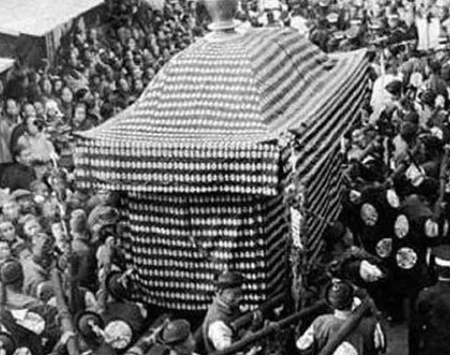 孙中山先生的丧礼用了一百二十八抬的棺材,孙中山先生逝世当天,国民政府内便成立了近三百人的治丧办事处,专门料理孙中山先生的后事,采用国葬规制,用青铜打造的灵柩,重达半吨,这些都是请当时北京的老字号杠房日升杠房承办的,其中花费想必不少。