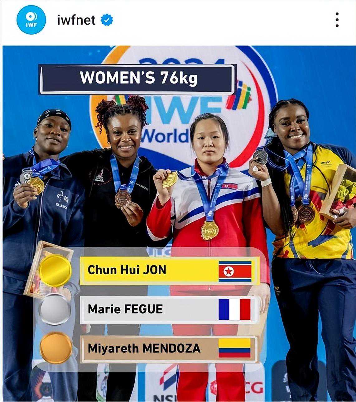 在女子76公斤级比赛中,25岁的朝鲜选手郑春姬以114公斤的抓举、145公斤的挺举、259公斤的总成绩战胜了总成绩为245公斤(抓举115公斤,挺举130公斤)的玛丽·佩格(32岁,法国),夺冠。