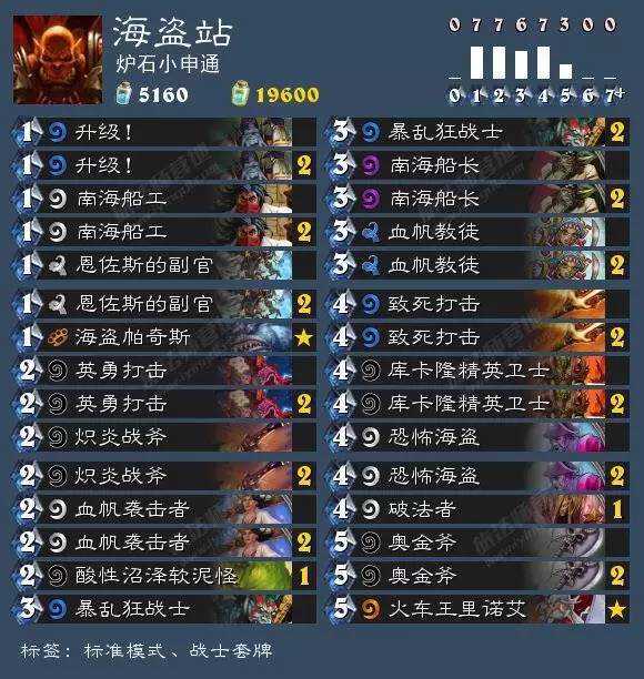 海盗战:还是当之无愧的T1卡组,坎出一片天,海盗战几乎不受退环境影响,同时还加入了新卡苦潮多头蛇,生物质量更高,不过祸福相依,新卡葛拉卡爬行蟹也是很针对海盗战,这里控哥推荐自己用的海盗战,比较传统,没有多头蛇,加入了一个小软和破法,不然打任务战总是抢不死。