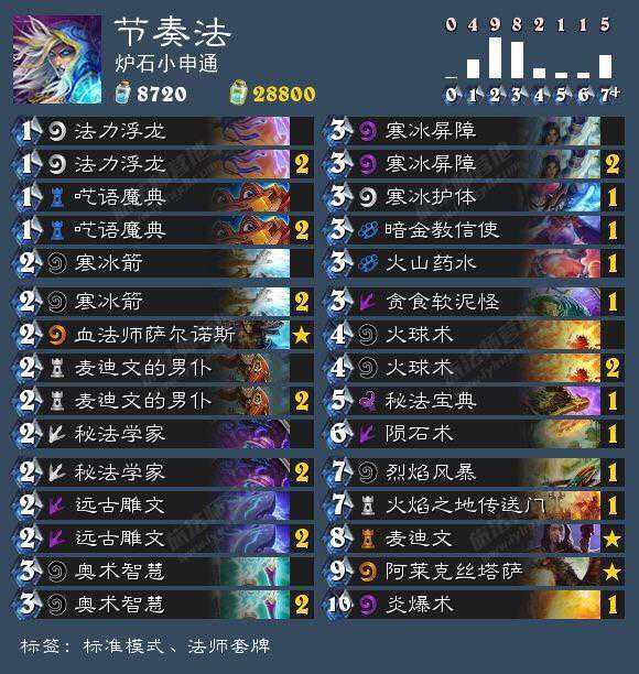 节奏法:最近法师最流行的卡组,秘法学家与远古雕文这两张张卡,配合麦迪文的仆从相当于多了两个寒冰箭,还能战场,实在是太好用,这套牌前期靠浮龙等随从蹭血控场,然后中期就要靠火门麦迪文解场战场,后期靠冰箱撑回合数扔伤害斩杀的。