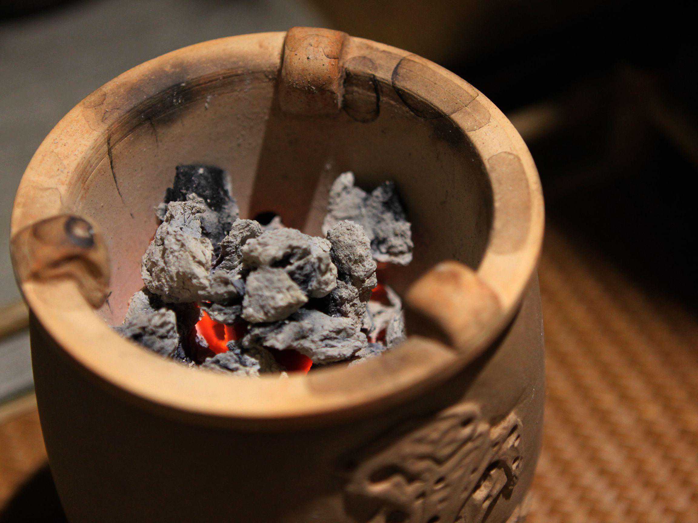 碳的大小在一到两公分为佳,这个要根据炉子内胆的大小来定,五到六块垒叠,中间要有空隙,便于通风取火,燃烧的炭火有两种状态,分为文火和武火也称为阴火和阳火之分。煮茶要用武火,我们称之为活火,活火烹泉。要靠炭才能引动清风度山林,才能得好汤好味。