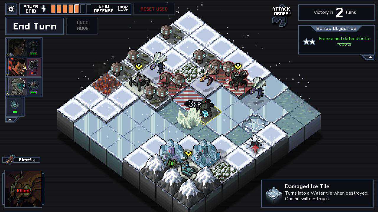 同时本作还包含了一个击退系统,而活用击退不仅可以阻碍敌人的进攻意图,还可以附带地形伤害,比如让其掉入水中,掉进火里,敌人之间互相碰到会有伤害,击飞的敌人撞到地形单位也会对地形单位造成伤害。同时为了战斗更加的紧密,游戏的敌我血量不再是精准的数值,而是采用更加直观的“次数”概念,因此玩家每一次行动要考虑的条件要素都非常充实,某种意义上把本作看做是战棋游戏中的解密游戏也是可以的。非常值得一试!