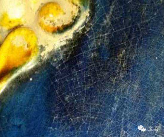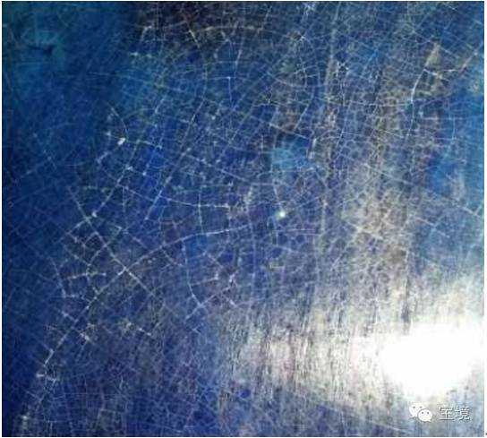 开片极为细小,有明显的均匀、细小的翘皮纹,因岁月流逝而出现老化磨损的现象。蛤蜊光明显,柔美悦目,通身施蓝釉。