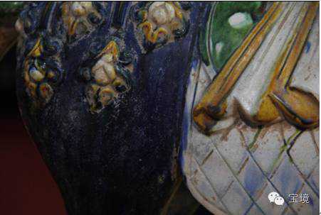 没有气泡,褐、黑等色的杂质带入釉里。釉面沁蚀自然,有返铅银斑,蓝釉中带有黑斑才是真正的进口料蓝釉唐三彩马,是鉴定唐代进口钴釉料蓝釉的根据痕迹。